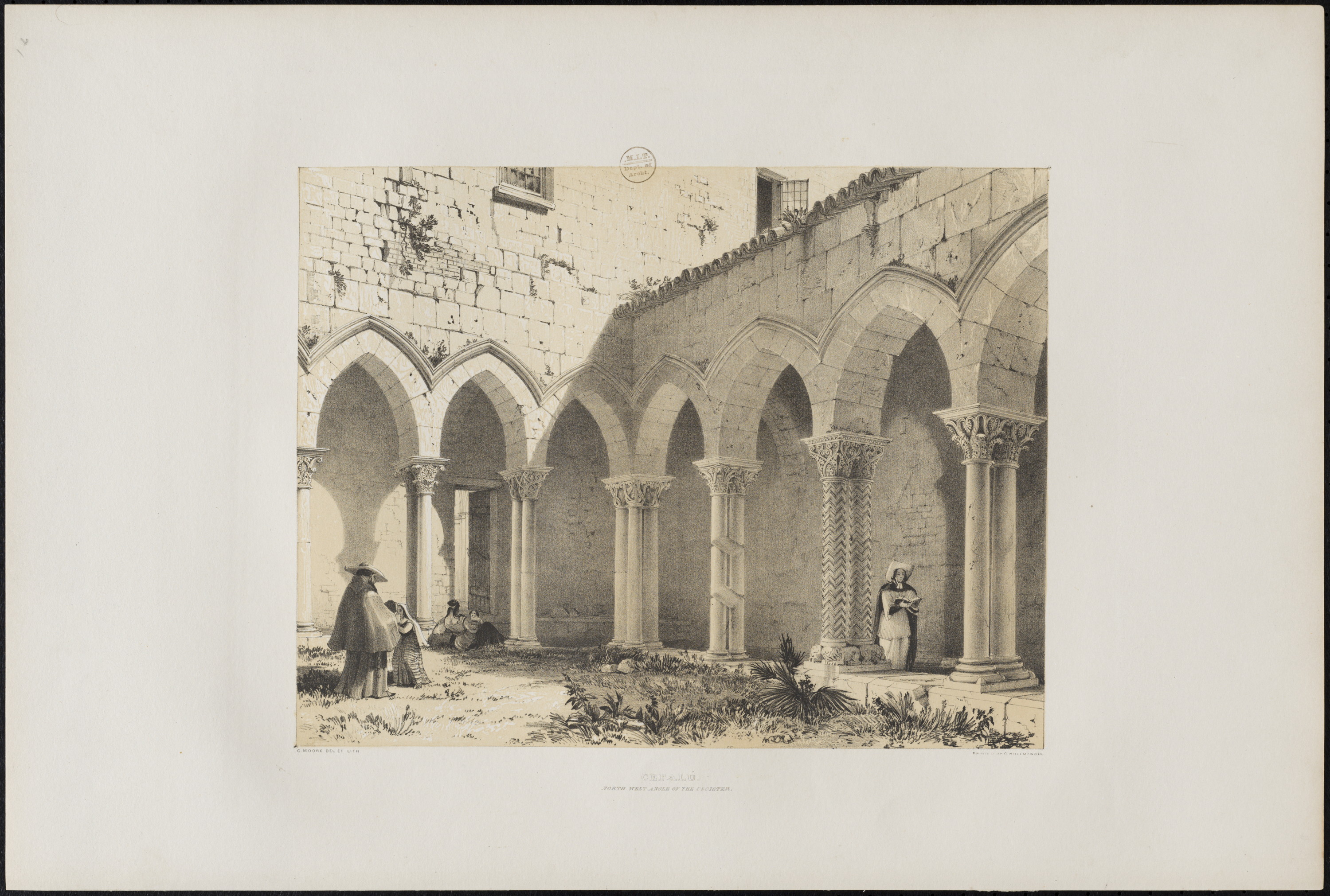 page, Plate XV, lithograph of the northwest corner of the cloister of Cefalu Cathedral, from "Saracenic and Norman remains"