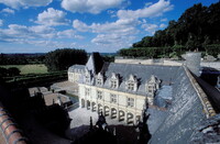 View from above of north pavilion showing court with moat and countryside beyond; The chateau is one of the last great Renaissance houses to be built on the Loire, and as such displays a Classical elegance reflecting Italian influence. It possesses features which are unusual in Touraine, such as rectangular pavilions (in place of the former round towers) in addition to the layout of the esplanade and its moat. It was originally a fortress, but nothing remains of that settlement except the keep, a square tower incorporated in the present structure. Acquired in the early 1500's by Jean Le Breton, France's Controller-General for War under King Francois I, a new château was constructed around the original 14th-century keep where King Philip II of France once met Richard I of England ("the Lionhearted") to discuss peace. The château remained in the Le Breton family for more than two centuries until it was acquired by the Marquis de Castellane. During the French Revolution the property was confiscated and in the early 1800's Emperor Napoleon acquired it for his brother Joseph Bonaparte. Source: Wikipedia; http://en.wikipedia.org/wiki/Main_Page (accessed 7/16/2008)