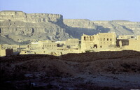 Distant view of the village, from south, depicting large bluffs in background; On the Tihama plain along the Red Sea, traditional housing is low, typically either huts of reeds, sticks and palm-woods (in the north, e.g. al-Zuhra), or rubble and brick courtyard houses (in the south, e.g. Zabid, Hays). Those in Zabid are of one or two storeys and present a plain façade to the street; the wealth and taste of the family are displayed in the decoration on internal walls. Zabid also has some Ottoman architecture. A different tradition is found in Tarim in Wadi Hadramawt, where Hadrami traders who had worked in Indonesia in the 19th century followed South-east Asian styles for their houses. Source: Grove Art Online; http://www.groveart.com/ (accessed 1/28/2008)