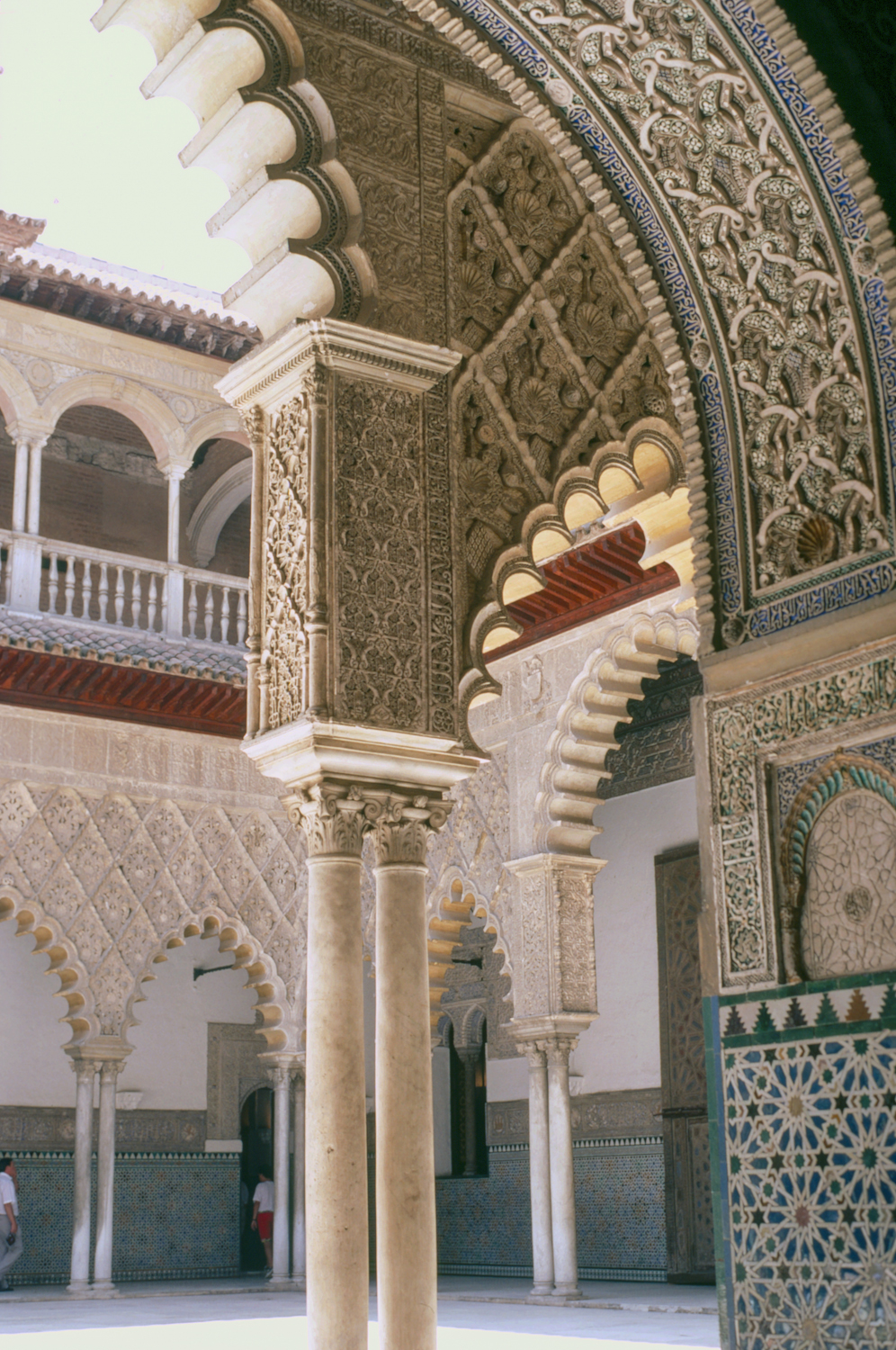 Gardens, Palaces, Courtyards, Seville (Spain), Almohad, Architecture, Domestic, Architecture, Islamic --Spain, World Heritage areas, Unesco, Arcades, Courtyards, Stucco, Multifoils, Coupled columns, Intradoses, Decoration and ornament, Islamic