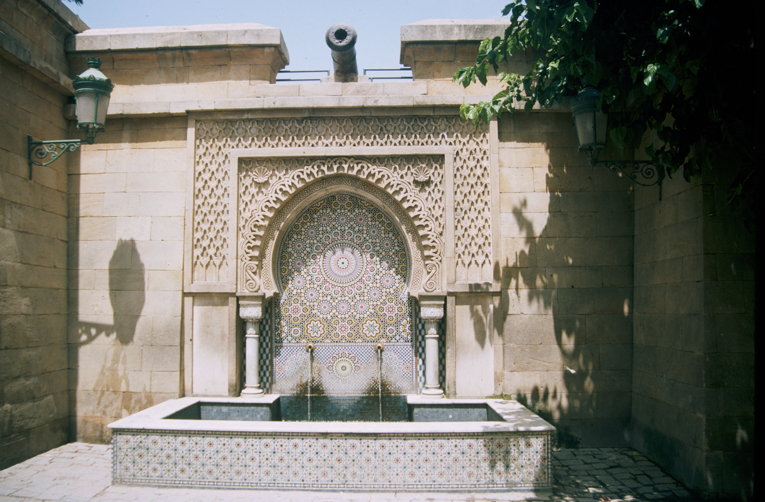 Conceived by French architects to house the growing indigenous population of Casablanca, this neighborhood was built on land donated by a Jewish merchant, Haïm Bendahan to the administration of Habous endowments.  It came out of the urban planning of Henri Prost in 1915 to accommodate the large numbers of North African immigrants into the city. front, fountain on the wall between the quartier de Habous Wall and the Qsar al-Maliki, 1993