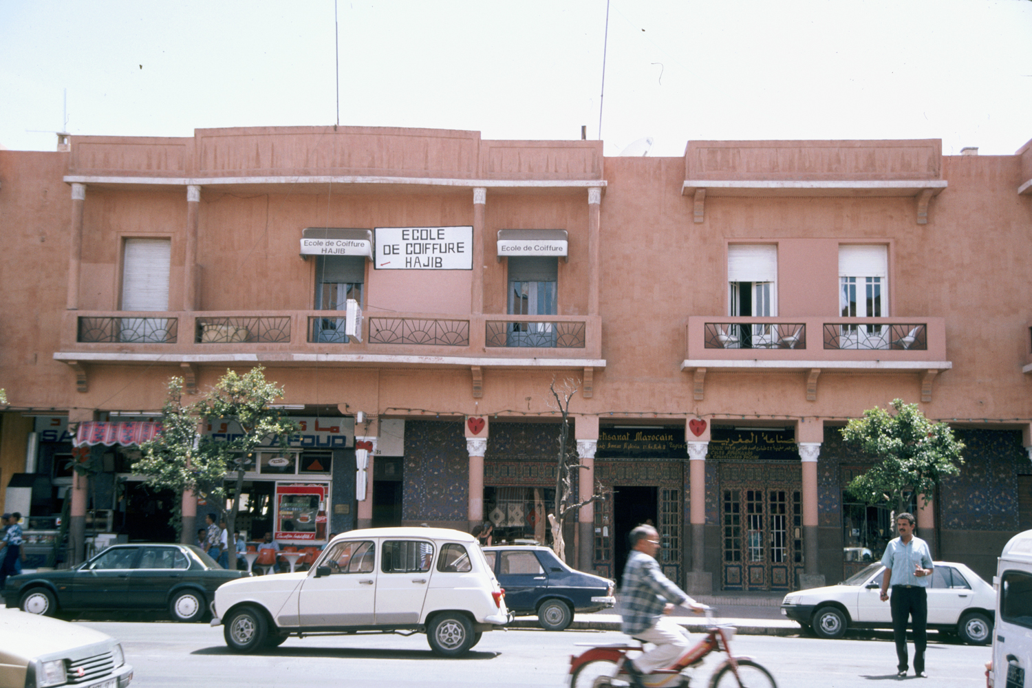 Planning and building of the new city of Gueliz began under the French protectorate in 1919, under the oversight of Henri Prost. Sources describer the architectural style of the architecture dating from the time as "art deco."  The wide streets and modern buildings were constructed in the 1920s and 1930s, but the area continues to transform to this day. exterior, commercial building viewed from across Avenue Mohammed V containing "hanouts" and other small businesses , 1993