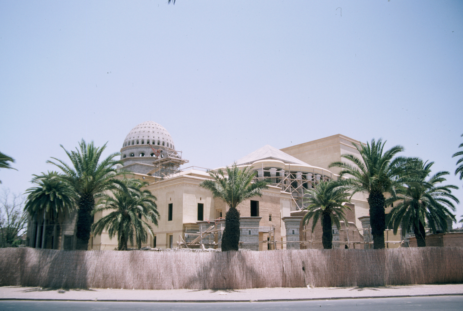 The Théâtre Royal in Marrakech was designed by Charles Boccara, an architect born in Tunisia who grew up in Morocco. Planning for the theater began in 1978 and construction started in 1986. It was subjected to many stops and starts, and though the inauguration was held on the 19th of September, 2001, only the 1200-seat open-air theater was completed. The interior of the 800-seat opera house remained unfinished as of 2011. Nonetheless, it is considered by many to be an architectural masterpiece with its imposing dome, brick arches, marble decorations, and use of a traditional construction technique/material called "tadelakt." It refers to a nearly highly water resistant type of time plaster that is used on both interior and exterior construction in the region of Marrakech, and which can be applied through different techniques to achieve various visual effects. exterior, full complex under construction, showing dome and pyramidal roof structures, 1993