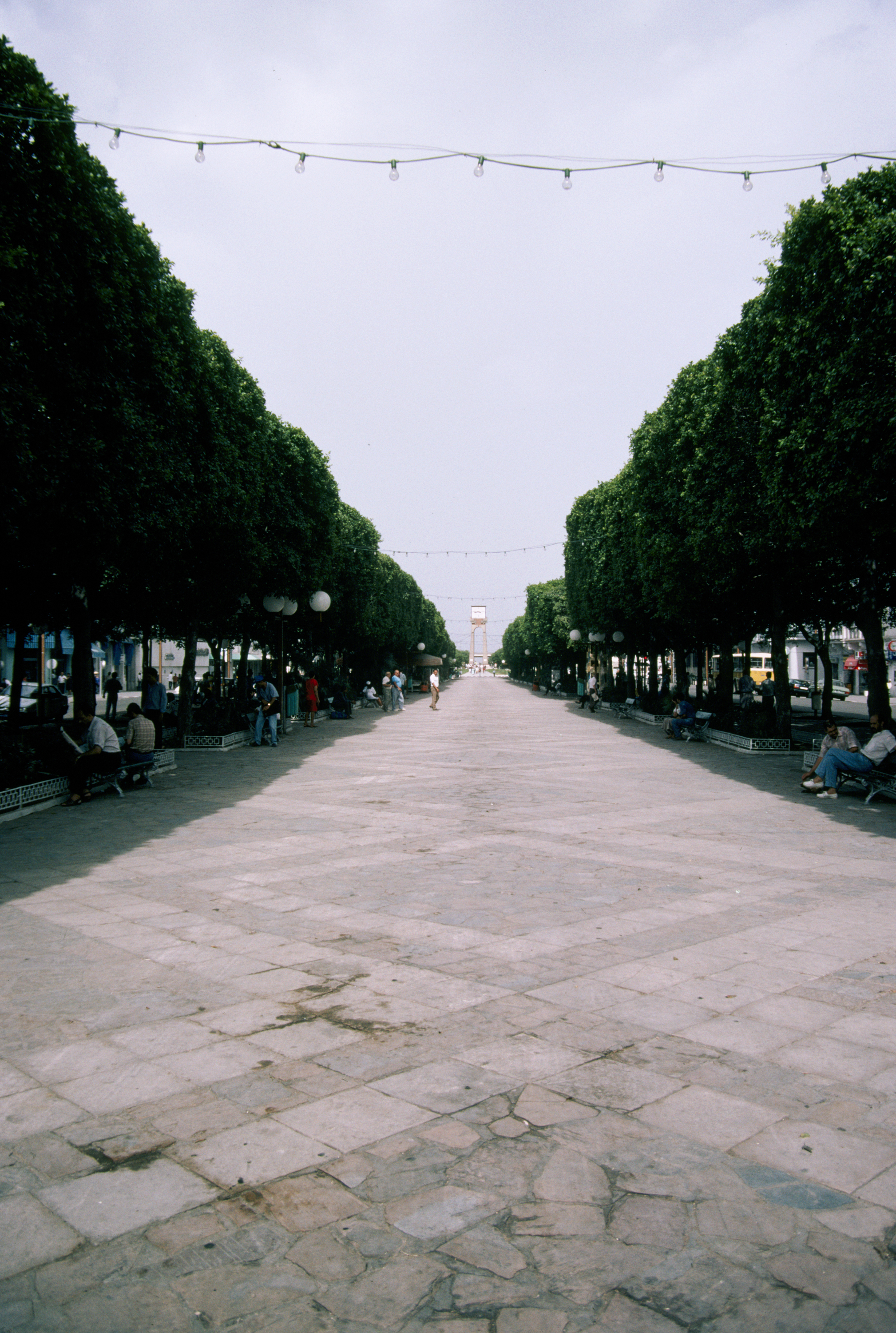 Tunis' main street, a wide, tree-lined pedestrian boulevard that connects the port and the medina. The name was changed from Avenue Jules Ferry to Avenue Habib Bourguiba after independence. general view, view towards Place due 7 Novembre, 1993