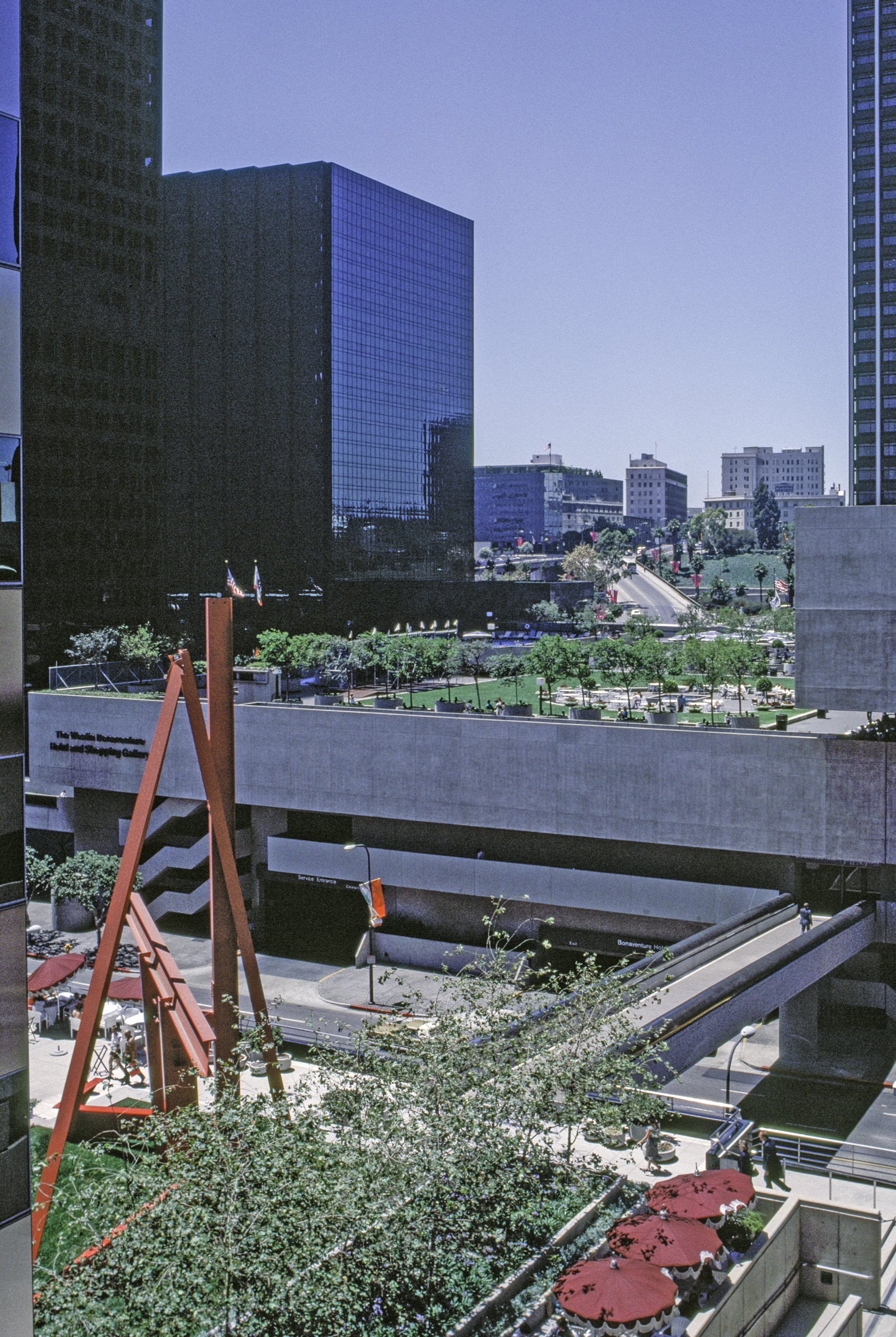 general view, downtown plaza with sculpture, 1984