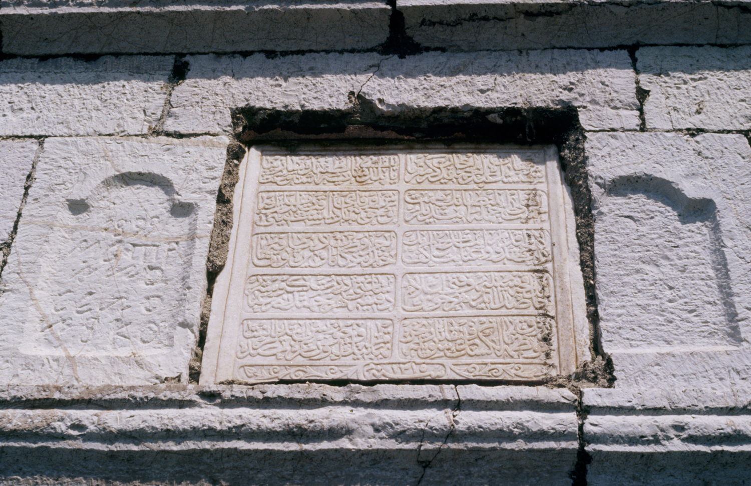 detail, marble inscription panel placed above the door leading into the tower on the south side, 1992
