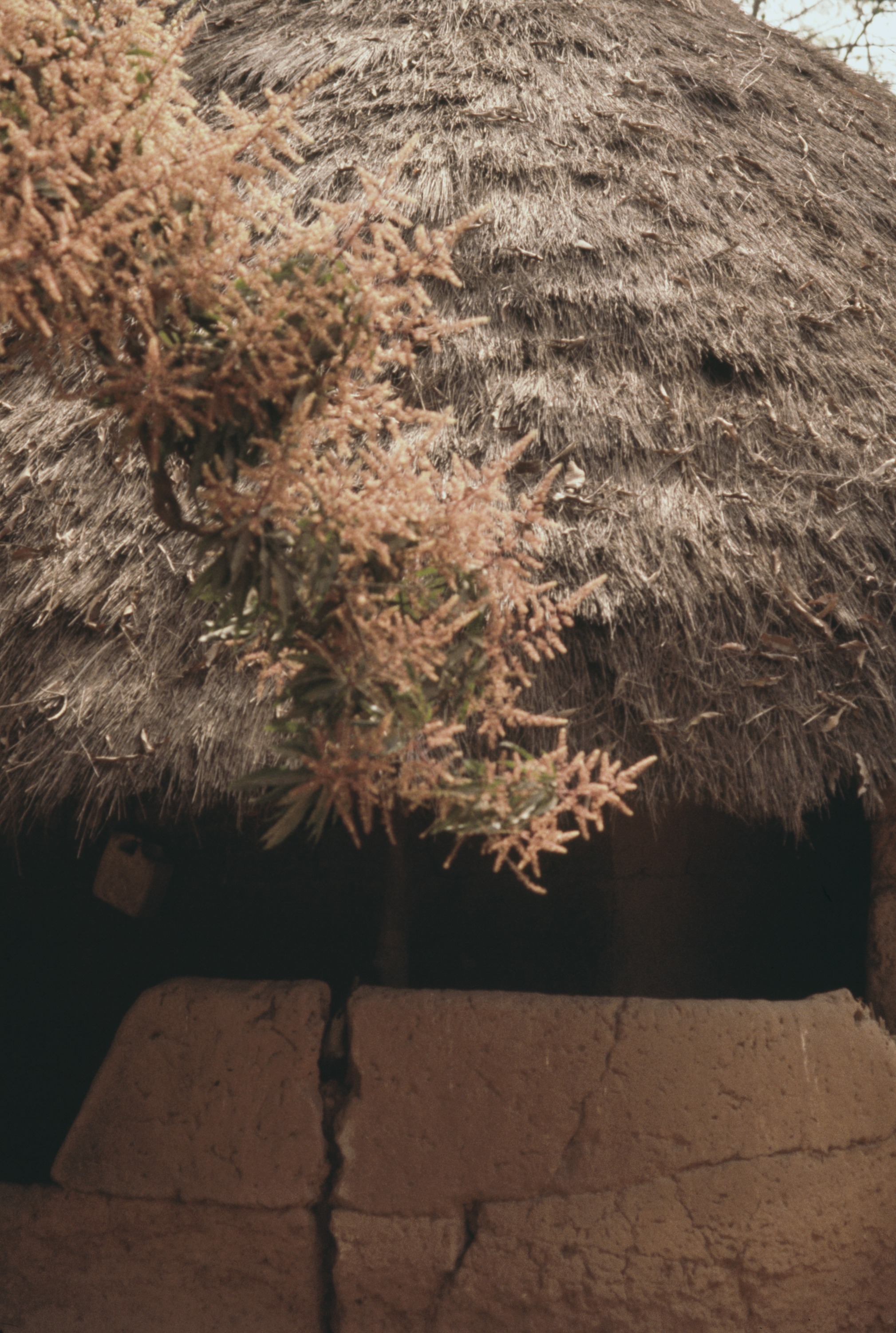 exterior, typical house with clay walls and thatched roof, detail of thatching, 1988