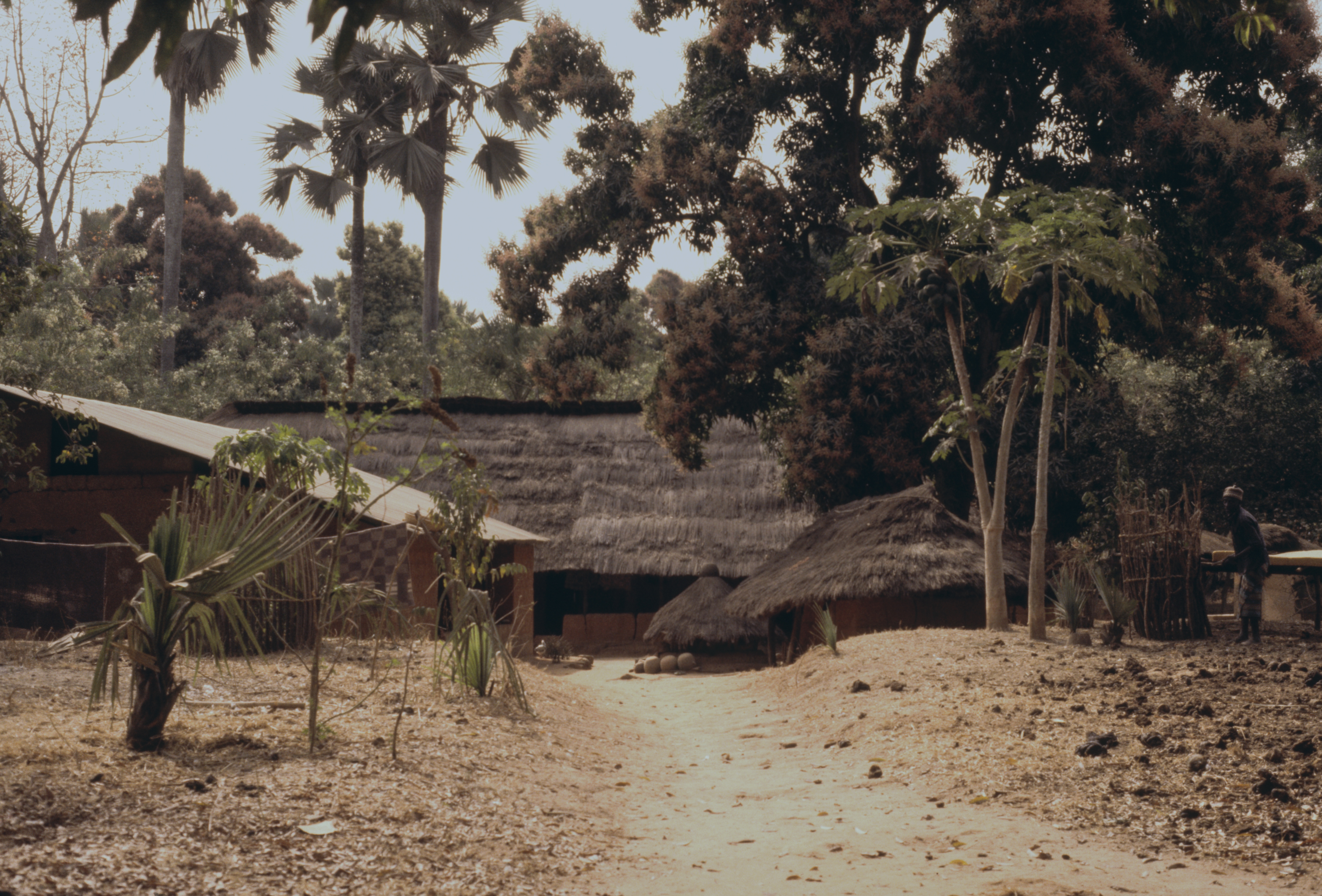 general view, typical houses - clay walls with thatched roof, 1988