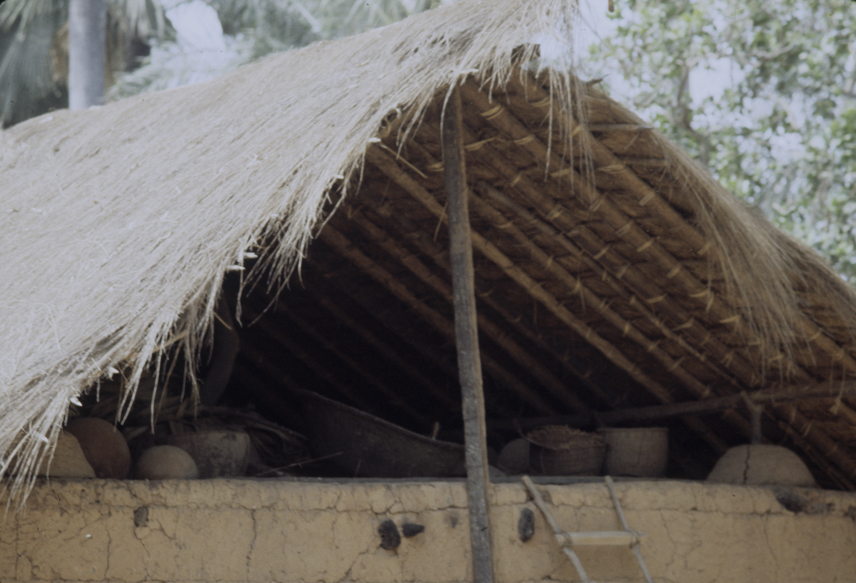 exterior, detail of a typical house - clay walls and thatched roof, 1988
