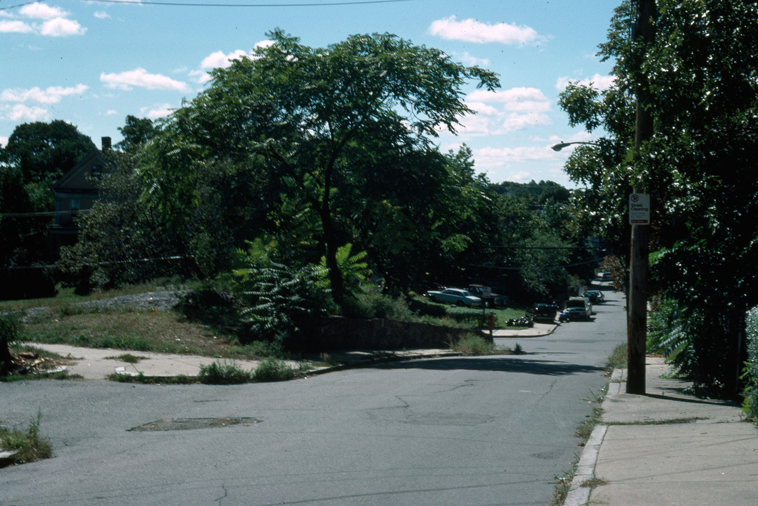 Fashionable development featuring fine views, good air, proximity to city. Situated near the only land route to and from Boston. general view, street with vacant lot, 1987