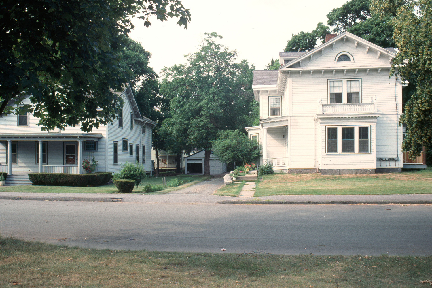 Walnut Park (Briggs Place) and Waban Park; first suburban subdivision in Newton and the first of Newton’s oval residential parks. general view, houses, as viewed from green space across street, 1988