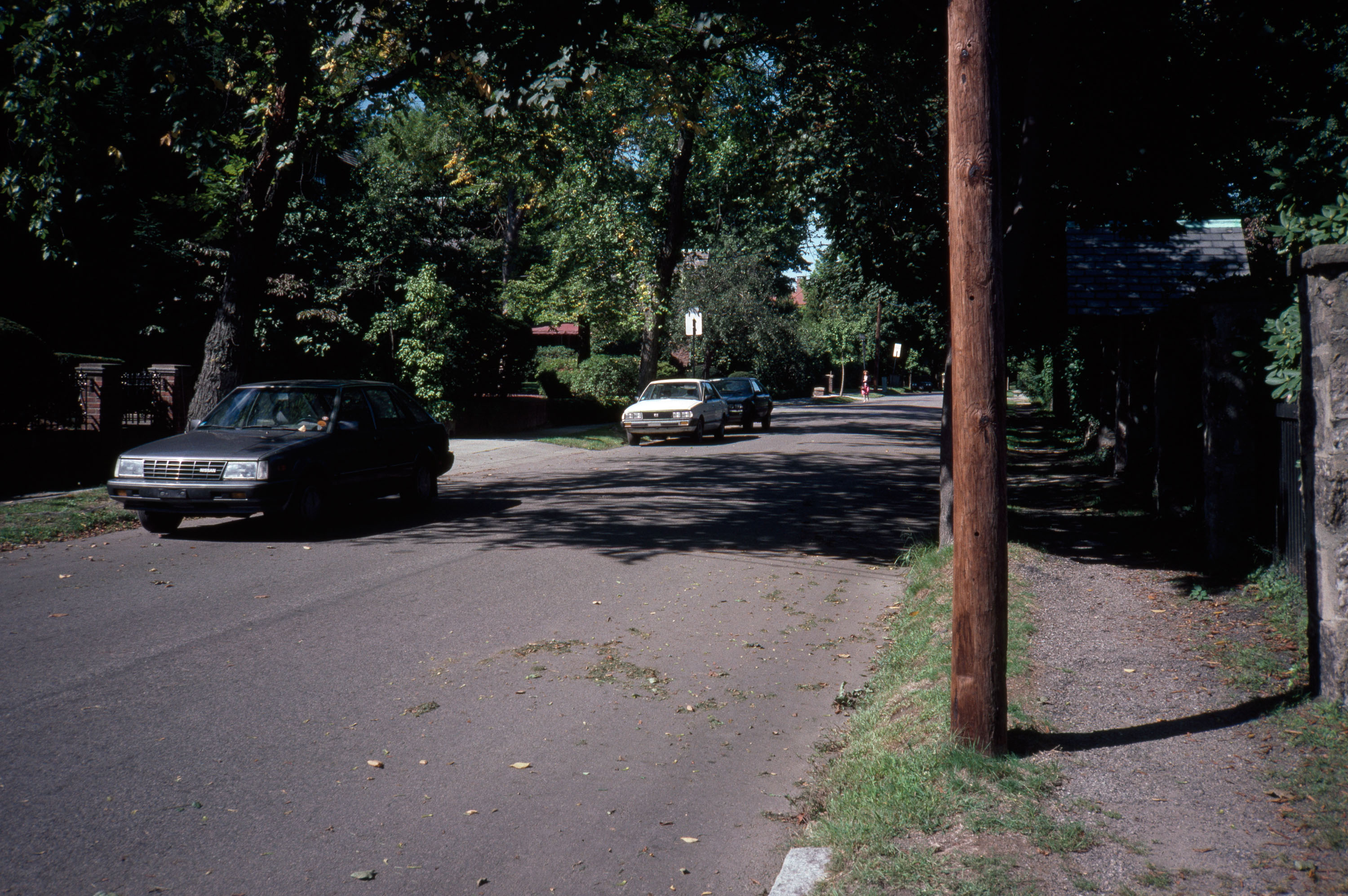 Exclusive residential park, favoring A. J. Downing ideals, built on 200 acres of Longwood area; detailed design and occupancy restrictions. general view, view down residential street, from sidewalk, 1987