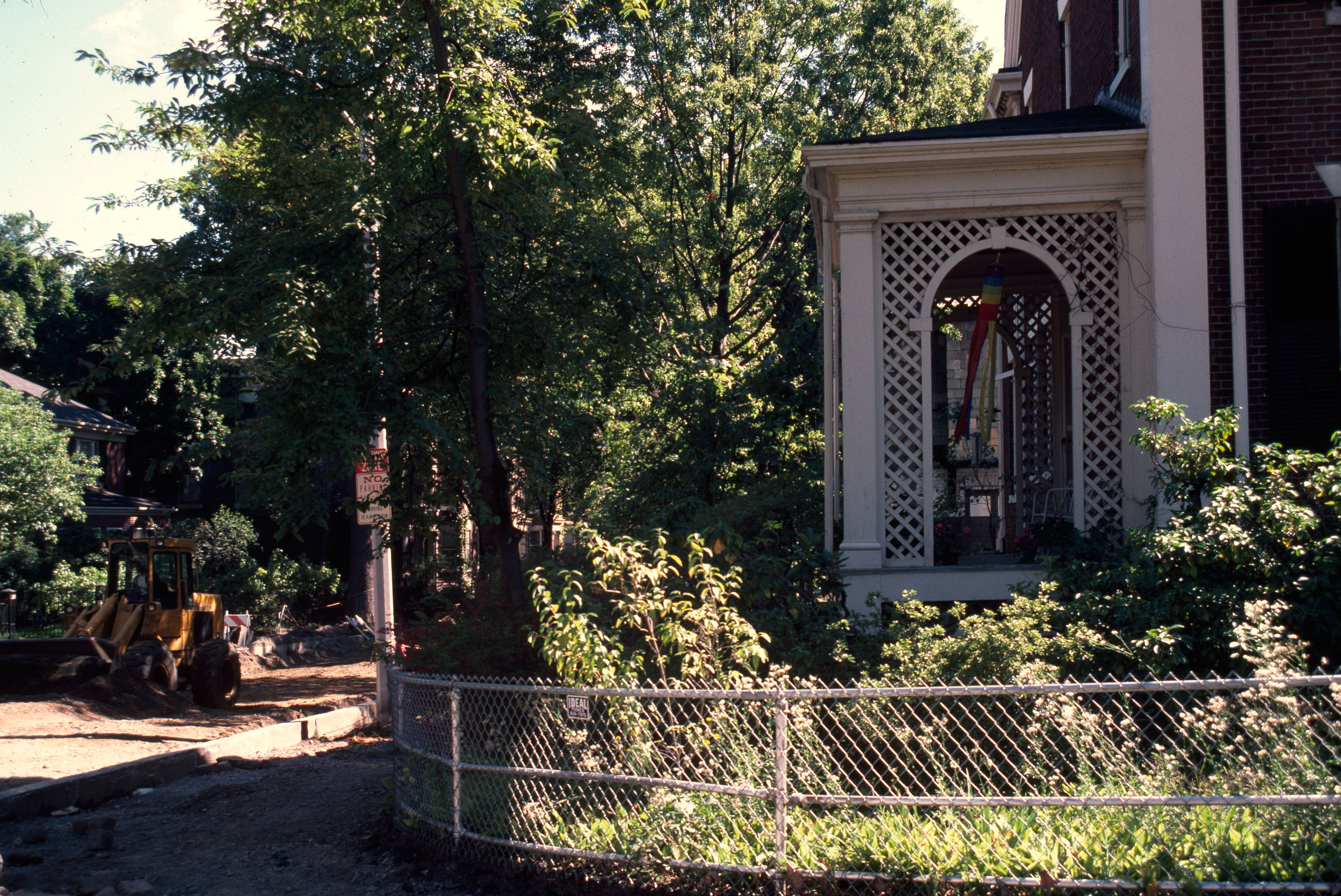 Exclusive residential park, favoring A. J. Downing ideals, built on 200 acres of Longwood area; detailed design and occupancy restrictions. general view, house at street corner, with street under reconstruction, with backhoe, 1987