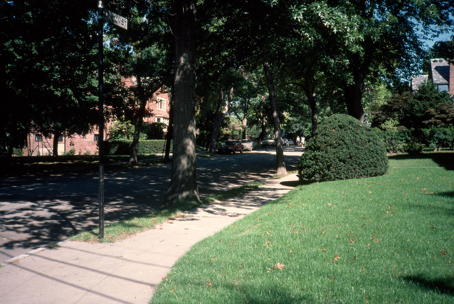 Exclusive residential park, favoring A. J. Downing ideals, built on 200 acres of Longwood area; detailed design and occupancy restrictions. general view, front yard adjacent to sidewalk and street, 1987