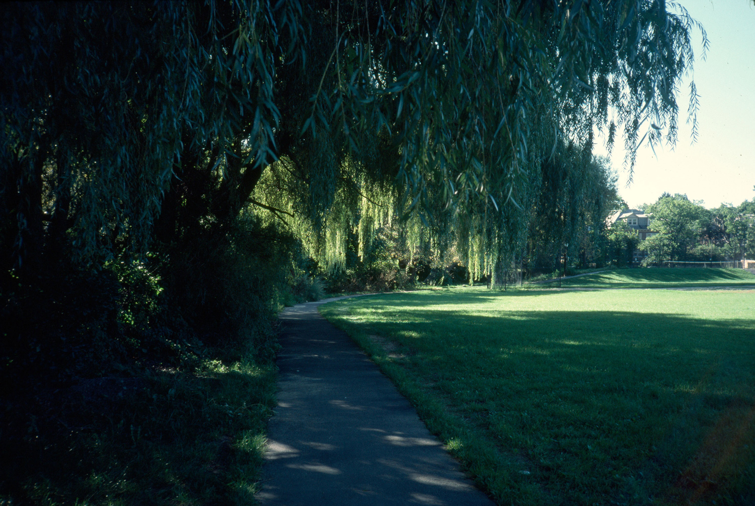 Exclusive residential park, favoring A. J. Downing ideals, built on 200 acres of Longwood area; detailed design and occupancy restrictions. general view, walkway alongside an expanse of lawn in Armory Playground, 1987