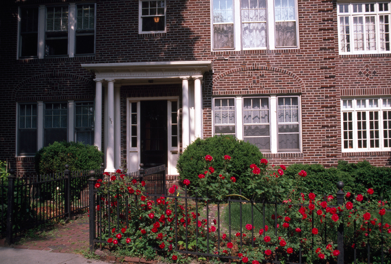 Curving road layout to accommodate hill site and earlier plan for hilltop park. general view, front door of a brick house, 1987