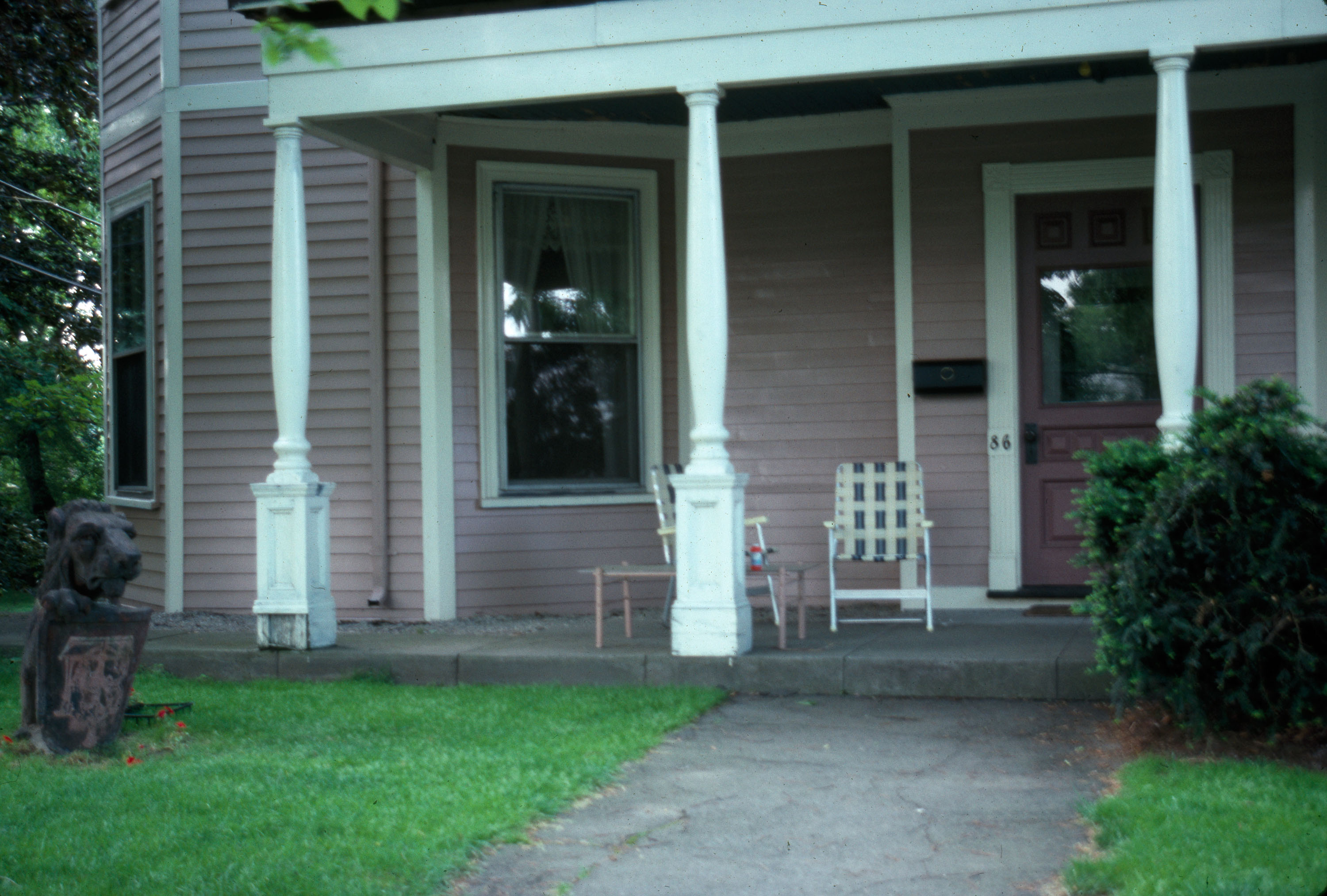 Curving road layout to accommodate hill site and earlier plan for hilltop park. general view, porch, front door of a house, 1987