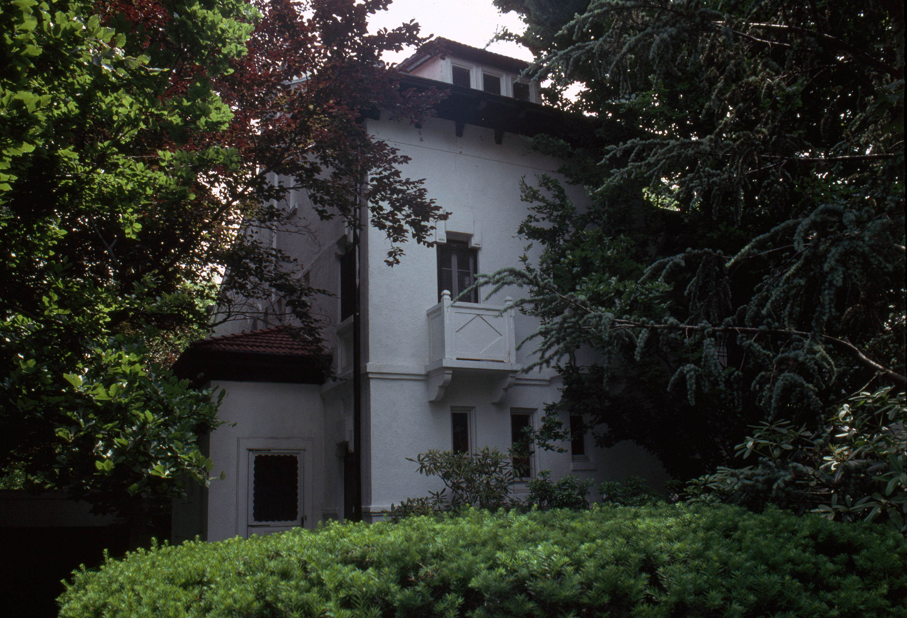 Estate subdivision of 165 acres laid out to accommodate topography and discourage through traffic. general view, stucco house partially obscured by foliage, 1987