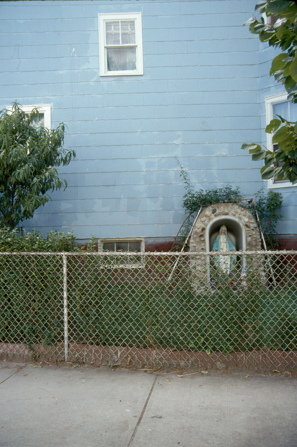 Post Civil War settlement stimulated by frequent commuter service (59 week-day trains by 1886). general view, yard with bathtub Madonna bordered by chain link fence, on Radcliffe Road, 1988