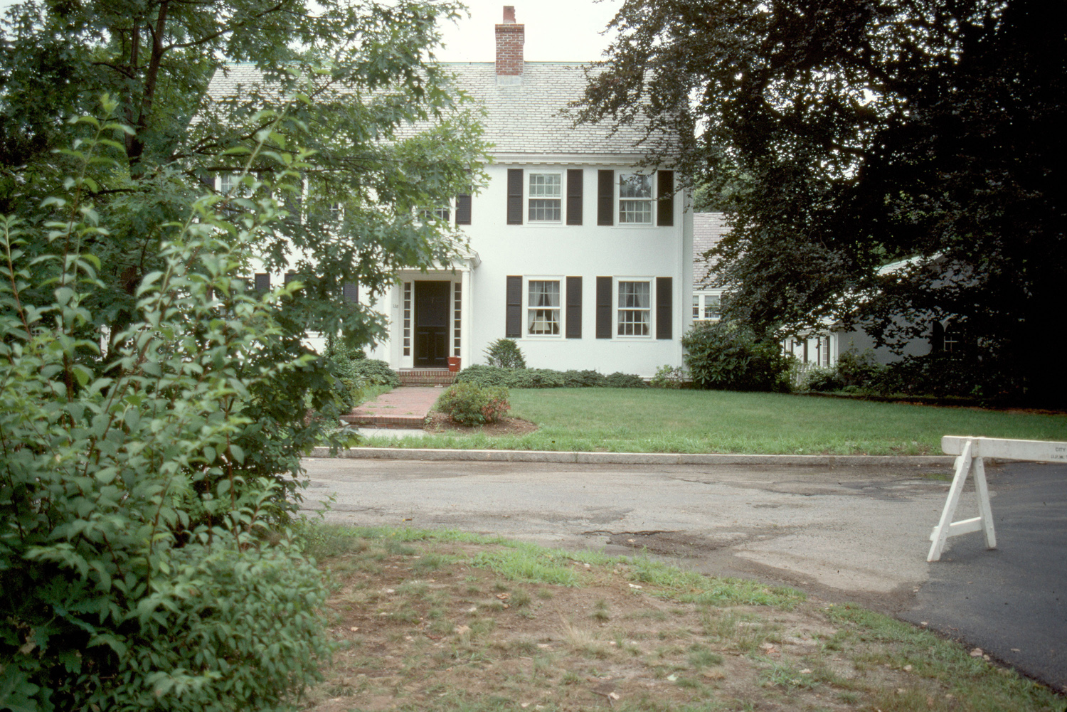 Picturesque plan for fashionable 300-acre subdivision, including Cochituate aqueduct as a natural feature; designed by early advocate of metropolitan park system. general view, house, partially obscured by foliage, as seen from across street, 1988