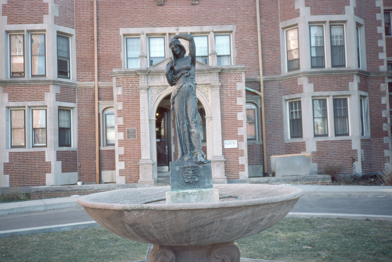 Tappan Street, Brookline MA 02445Precedent for apartment living as fashionable alternative to single-family residences. exterior, facade of Gordon Terrace, with bronze female statue by Lee Lawrie in fountain, 1988