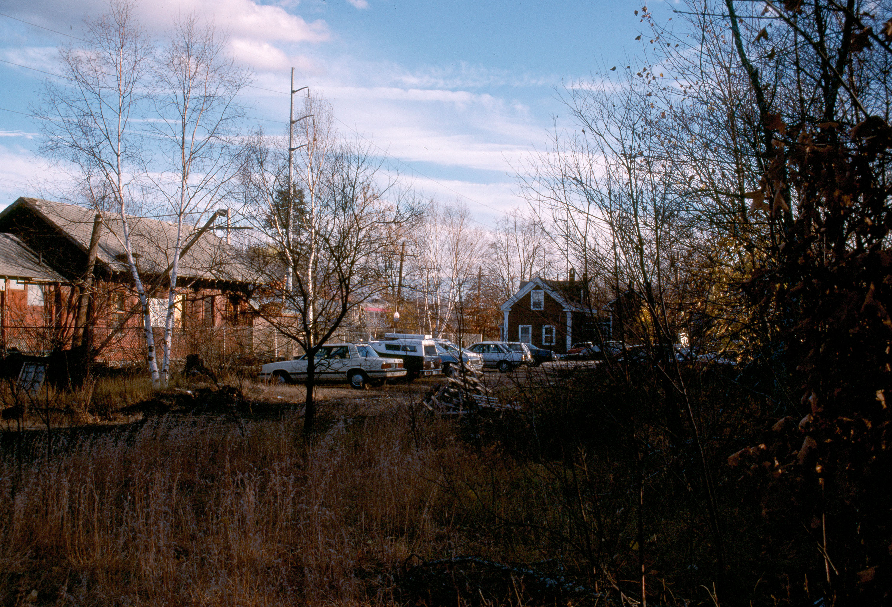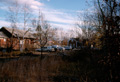 Model community of worker housing, not completed. general view, building and parking area as seen from wooded area, 1987