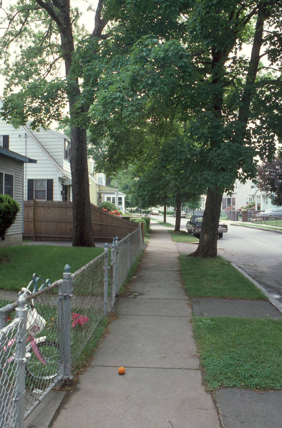 Development on four infill parcels as part of federal program to house defense workers. general view, sidewalk along residential street, 1987