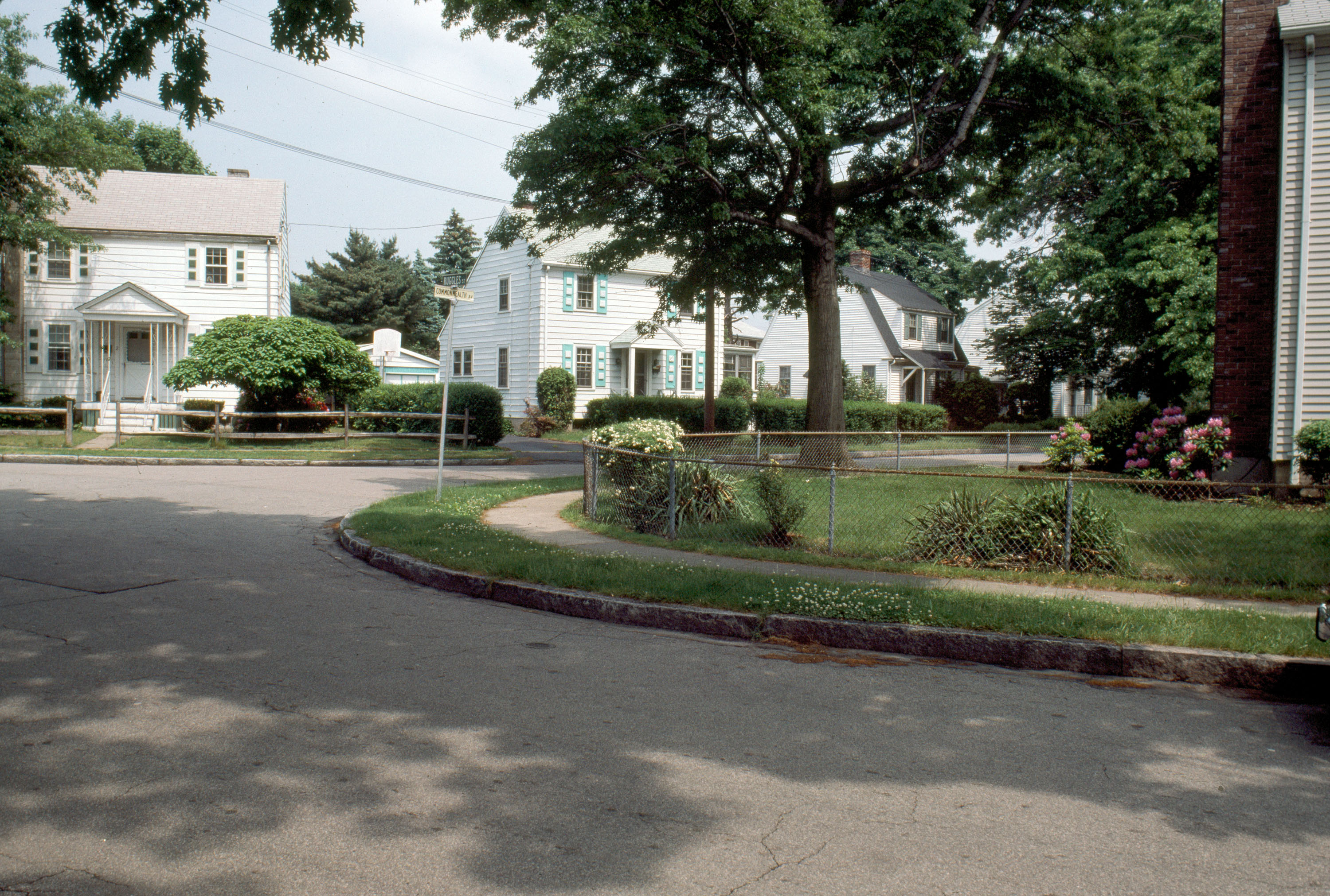 Development on four infill parcels as part of federal program to house defense workers. general view, residential street, 1987