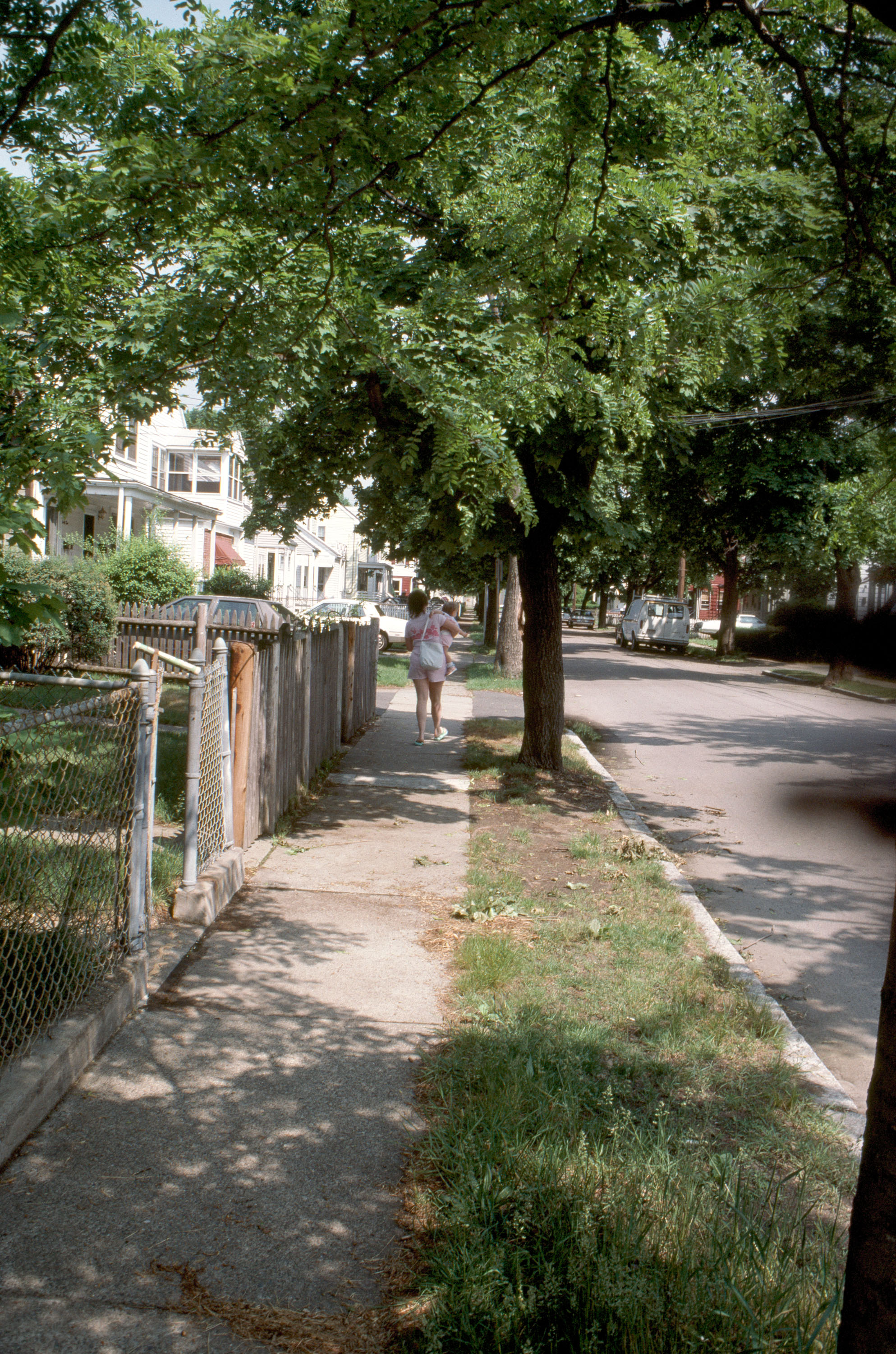 Development on four infill parcels as part of federal program to house defense workers. general view, street in Baker Yacht Basin area, 1987