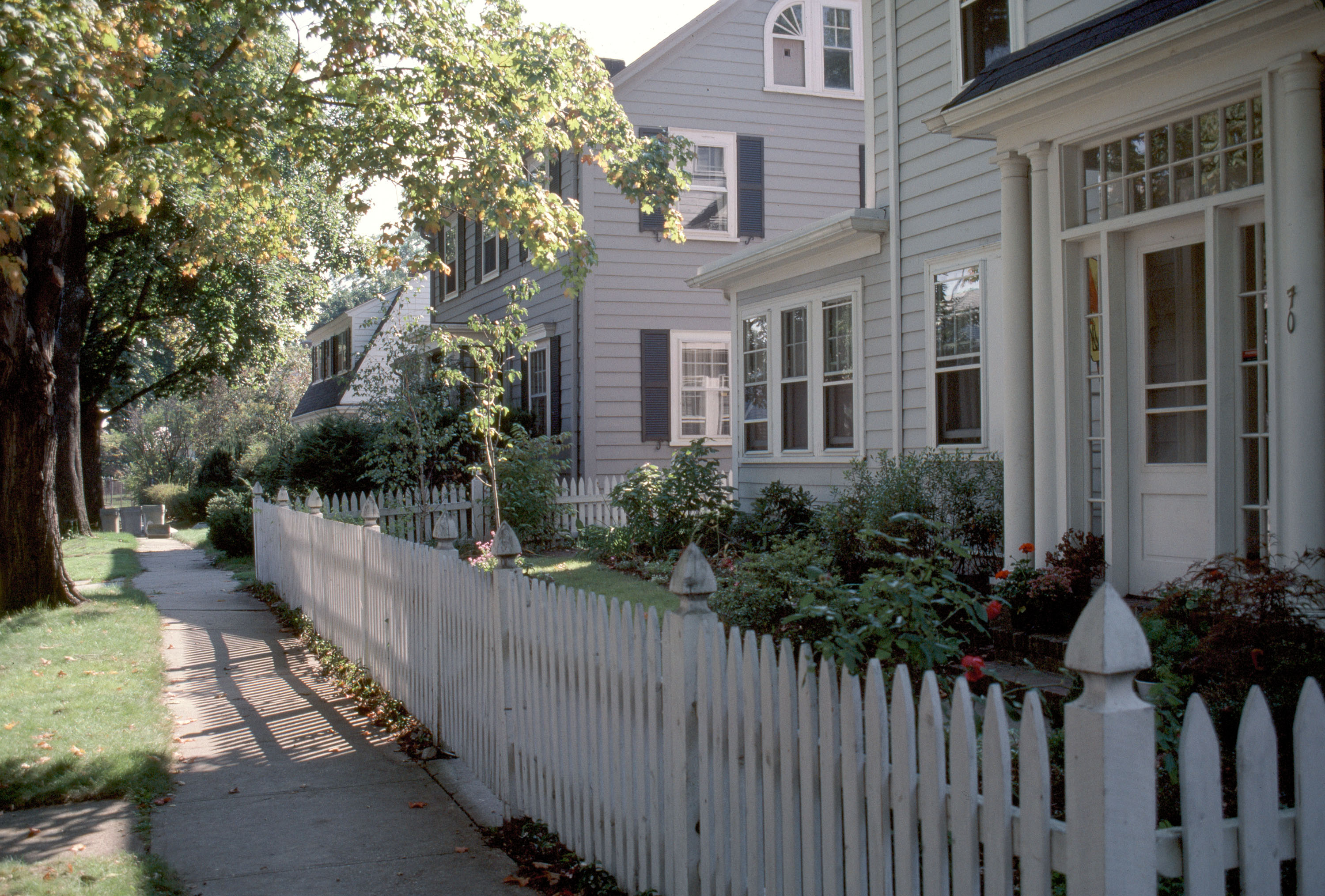 Subdivision of one of last Cambridge estates, picturesque plan contrasted with Cambridge grid pattern. oblique view, house with picket fence, 1987
