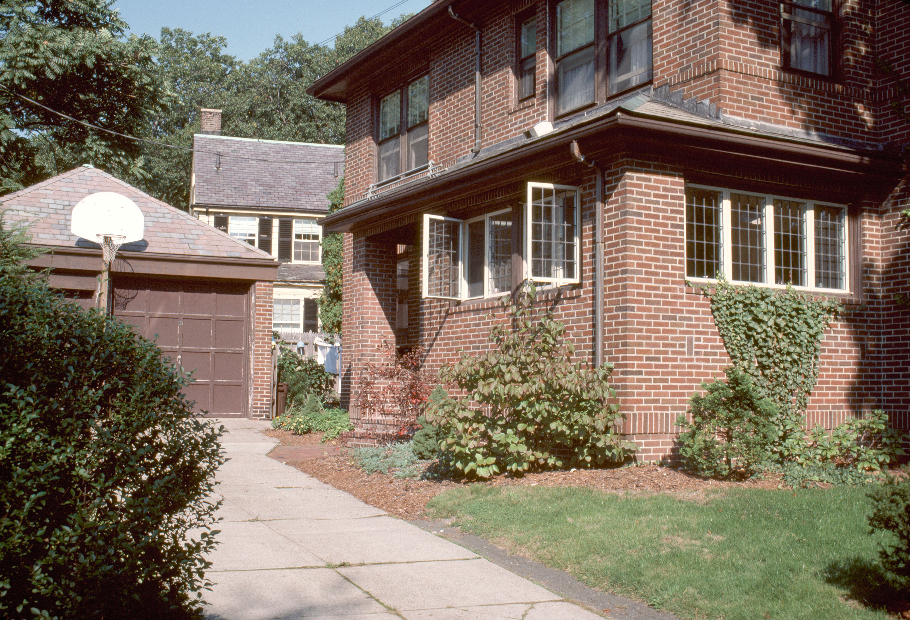 Subdivision of one of last Cambridge estates, picturesque plan contrasted with Cambridge grid pattern. general view, brick house with driveway, 1987