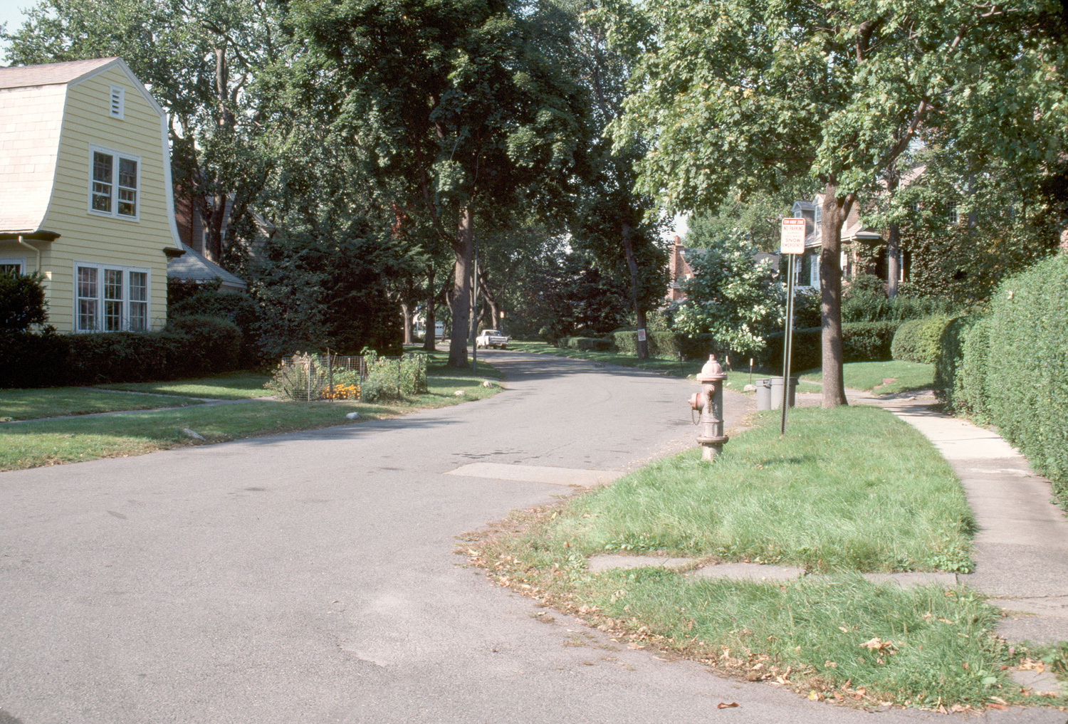 Subdivision of one of last Cambridge estates, picturesque plan contrasted with Cambridge grid pattern. general view, residential street, 1987