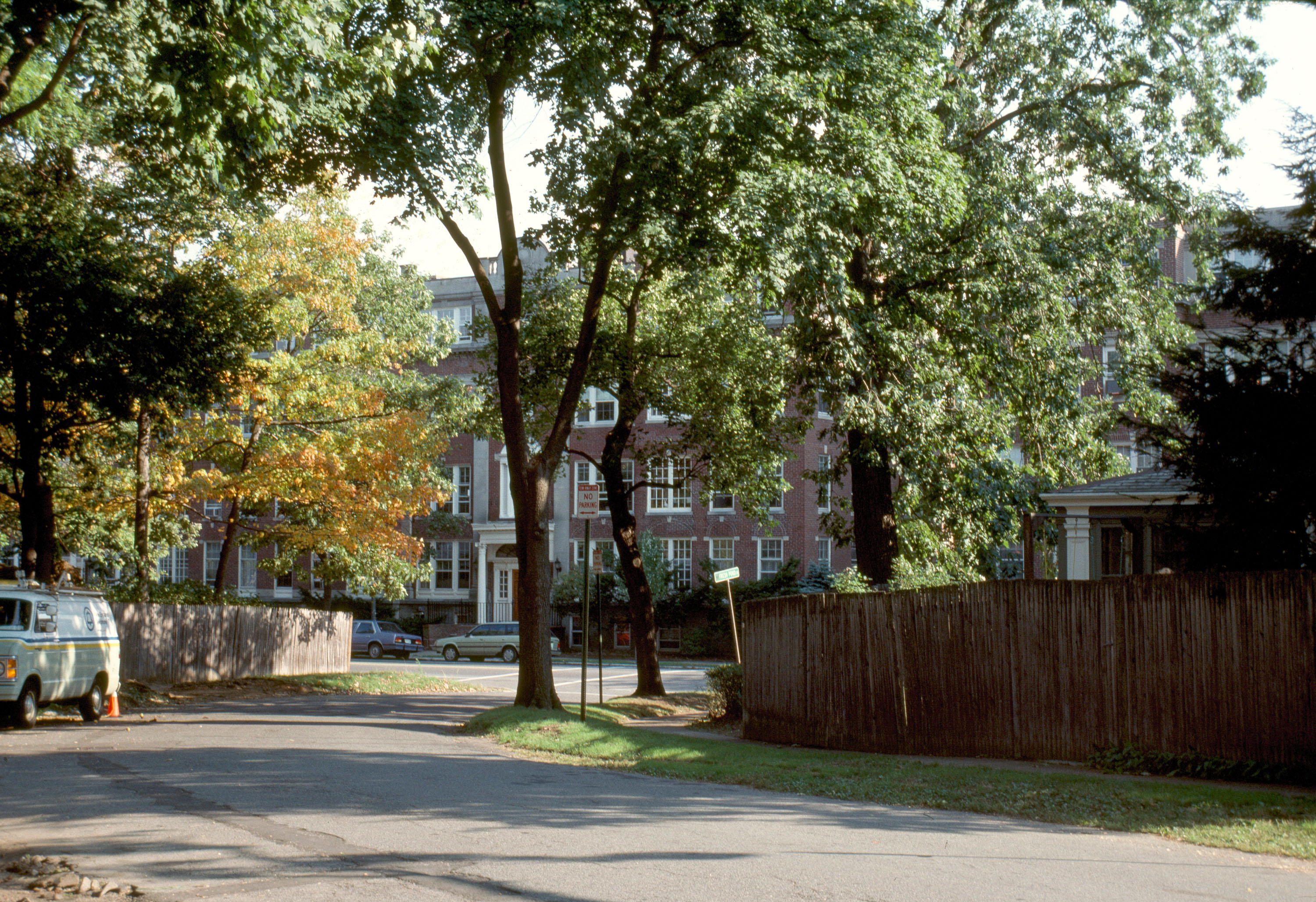 Subdivision of one of last Cambridge estates, picturesque plan contrasted with Cambridge grid pattern. general view, Fresh Pond Lane view south across Brattle Street to The Larches Apartments, 1987