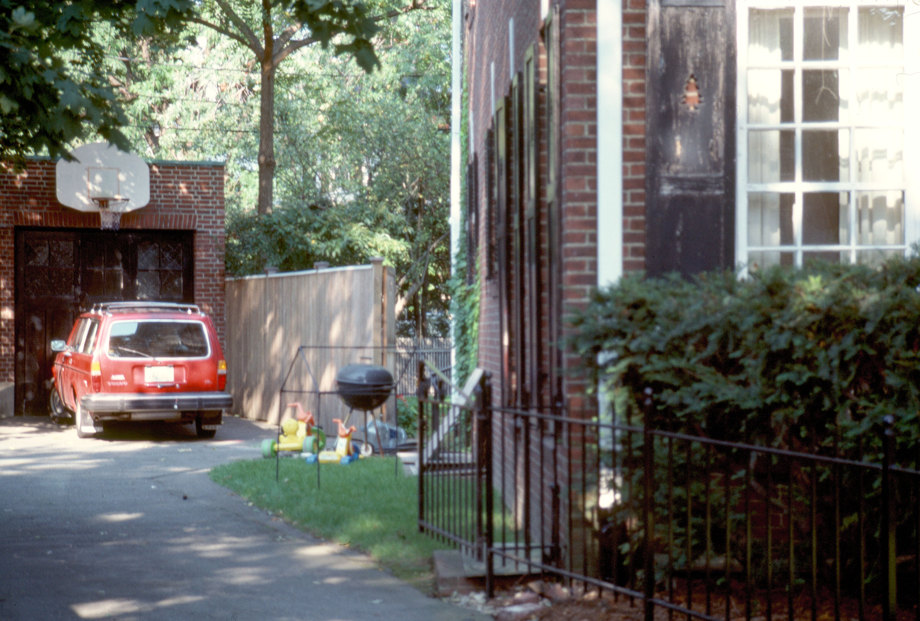 Subdivision of one of last Cambridge estates, picturesque plan contrasted with Cambridge grid pattern. general view, driveway and garage, 1987