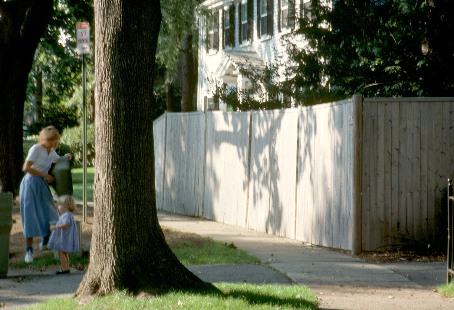 Subdivision of one of last Cambridge estates, picturesque plan contrasted with Cambridge grid pattern. general view, woman and child on Fresh Pond Lane, 1987