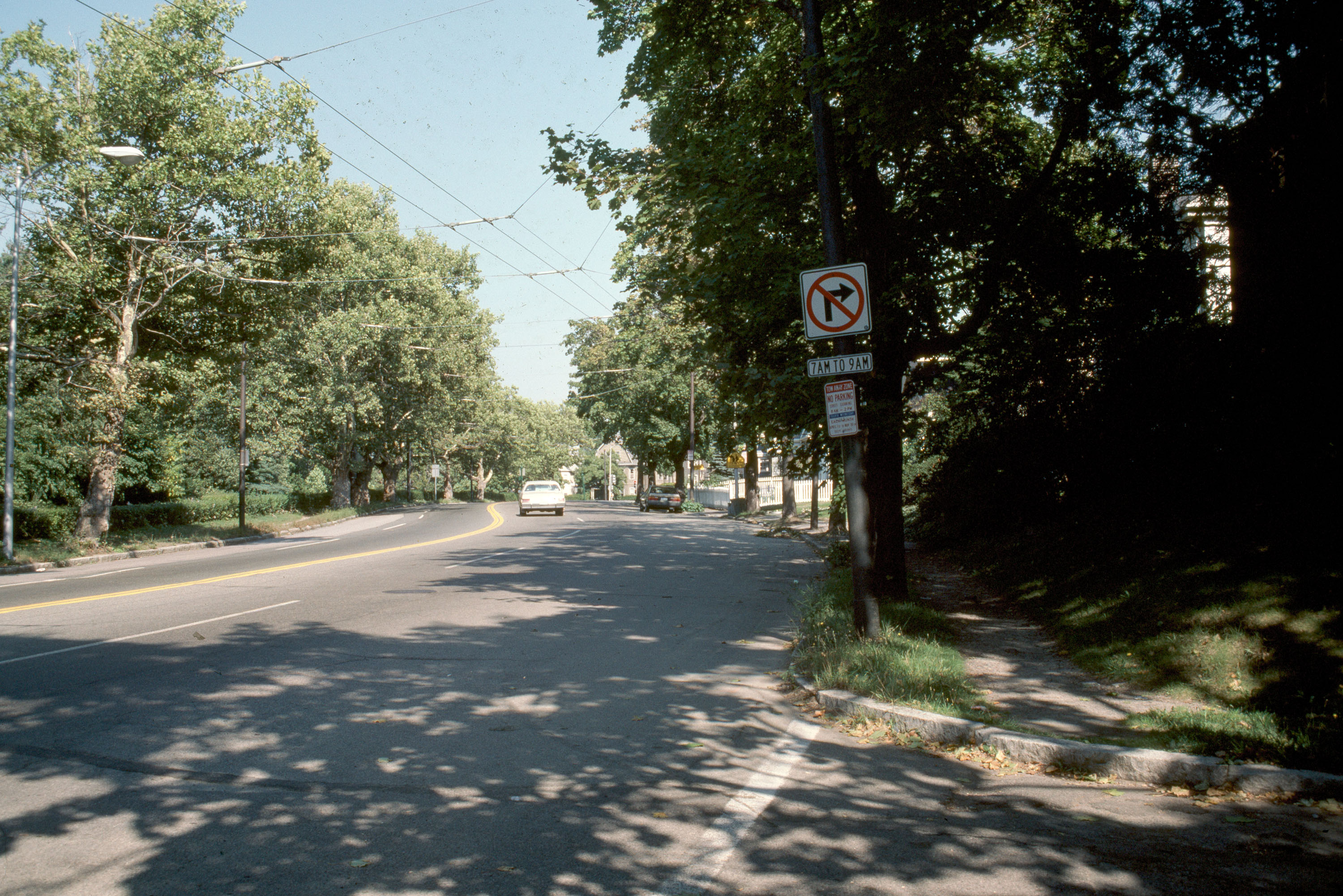 Subdivision of one of last Cambridge estates, picturesque plan contrasted with Cambridge grid pattern. general view, view northeast along Huron Avenue from entrance to Larchwood Drive, 1987