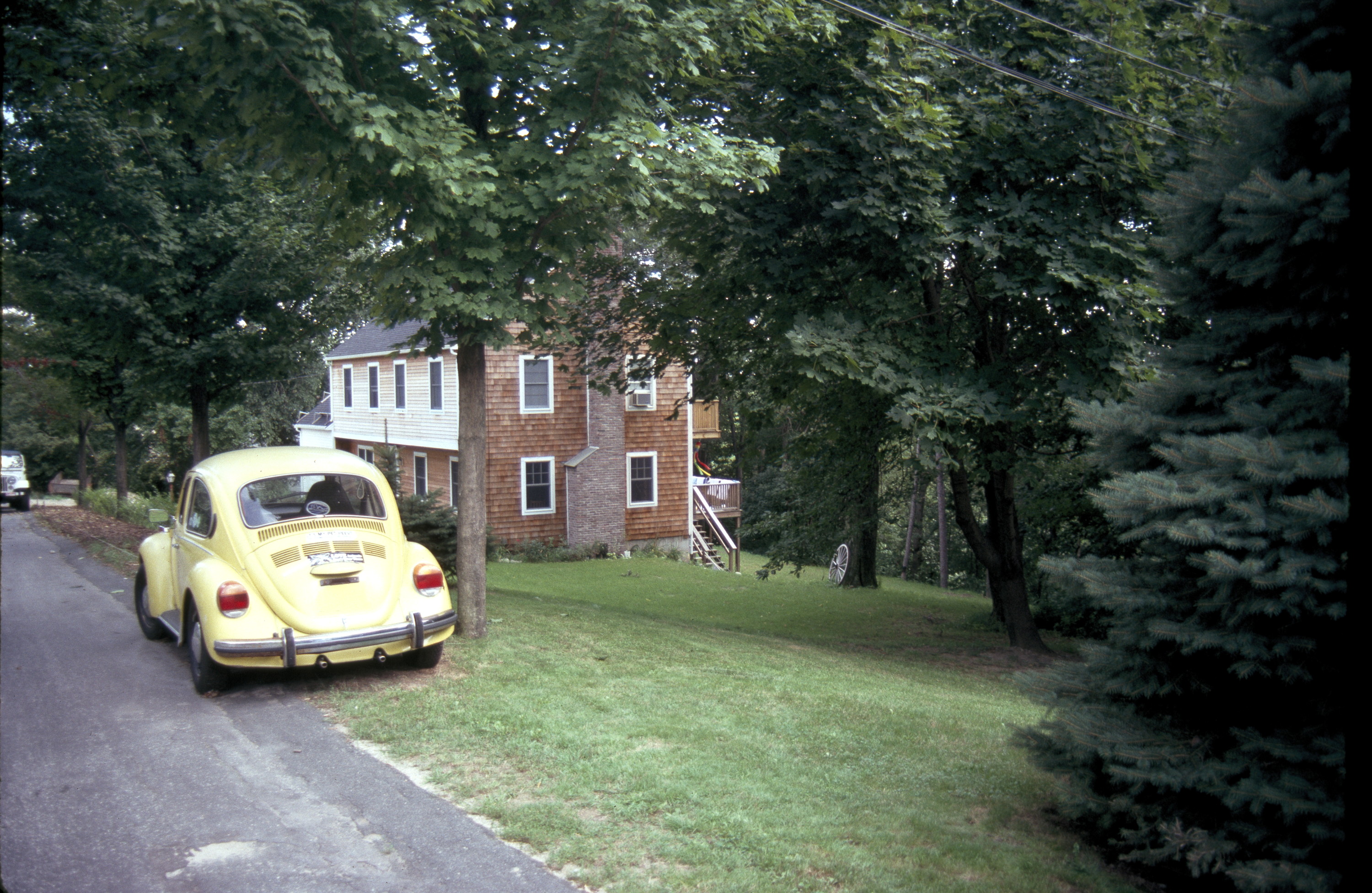 Subdivision of curving streets along hillside; recreation facilities; park planned but not built. general view, Volkswagen Beetle parked in front of a house, 1988