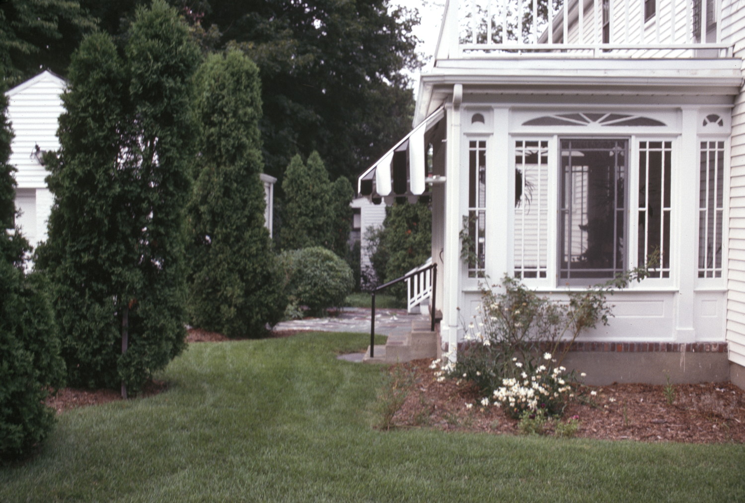 Subdivision of former estate near Boston College, featuring modern electric houses. general view, backyard and house with sun porch, 1988