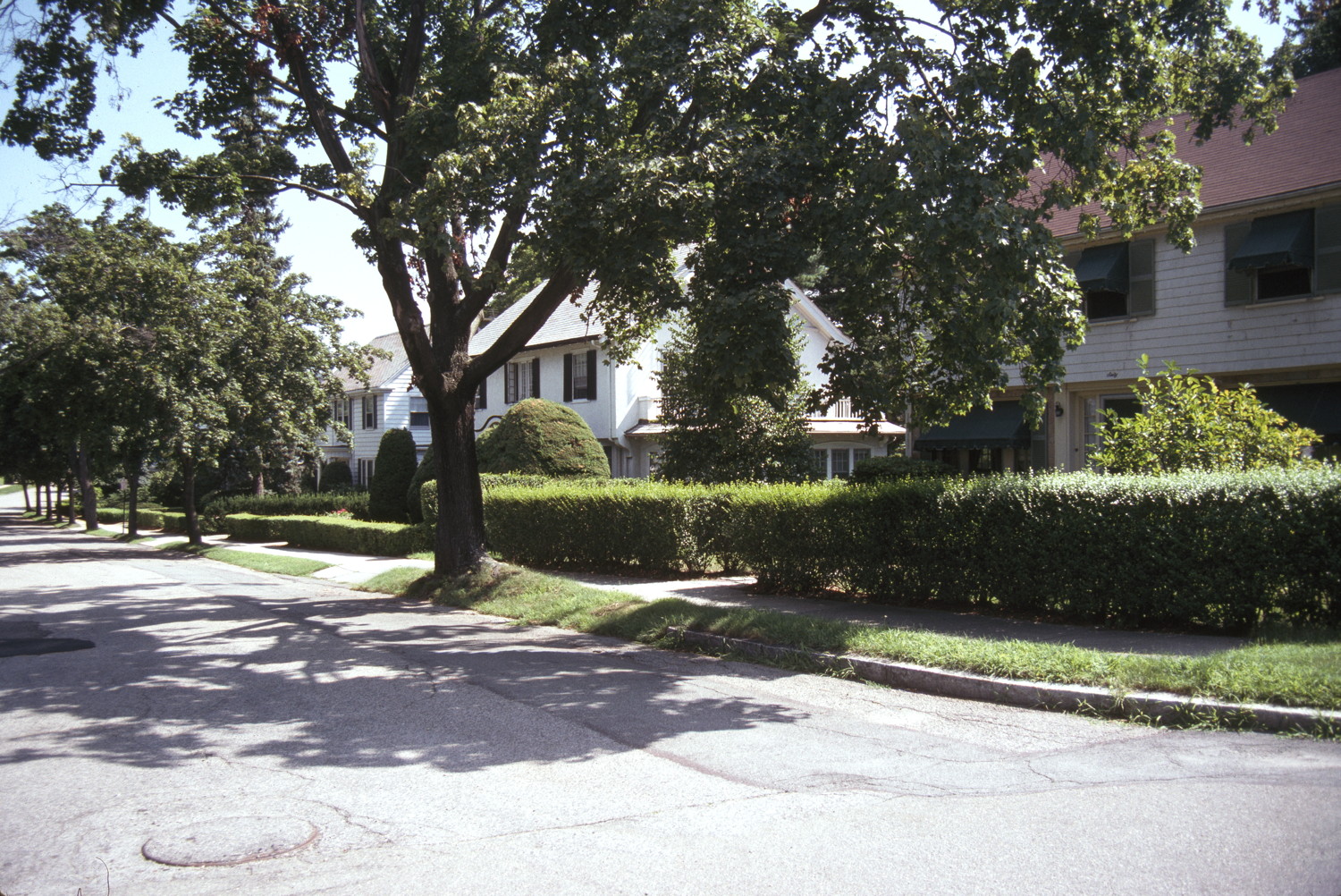 Subdivision of former estate near Boston College, featuring modern electric houses. general view, houses along tree-lined street, 1988