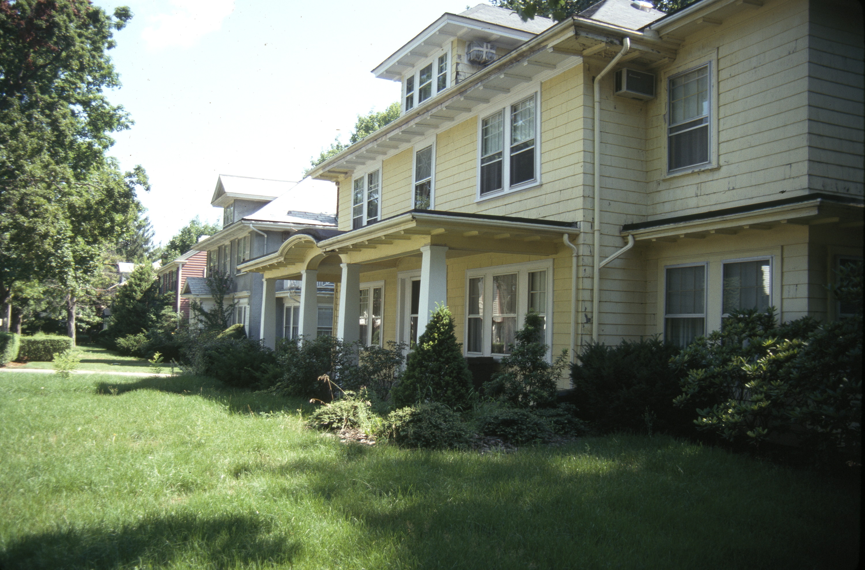 Subdivision of former estate near Boston College, featuring modern electric houses. general view, row of houses, as viewed from front lawns, 1988