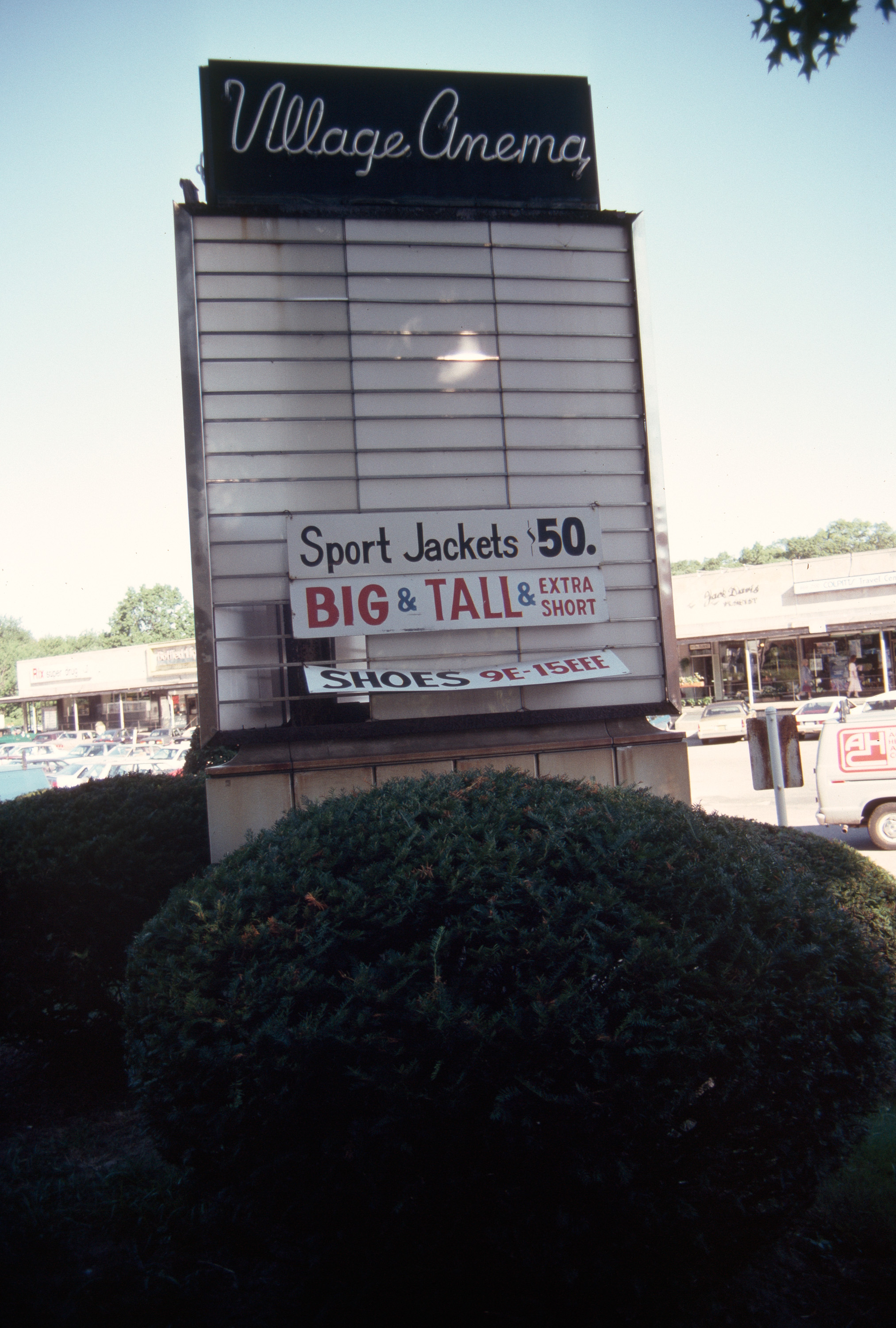 Park-and-shop in residential development, including 16 stores, cinema and medical clinic general view, freestanding sign for Village Cinema in shopping center, 1987