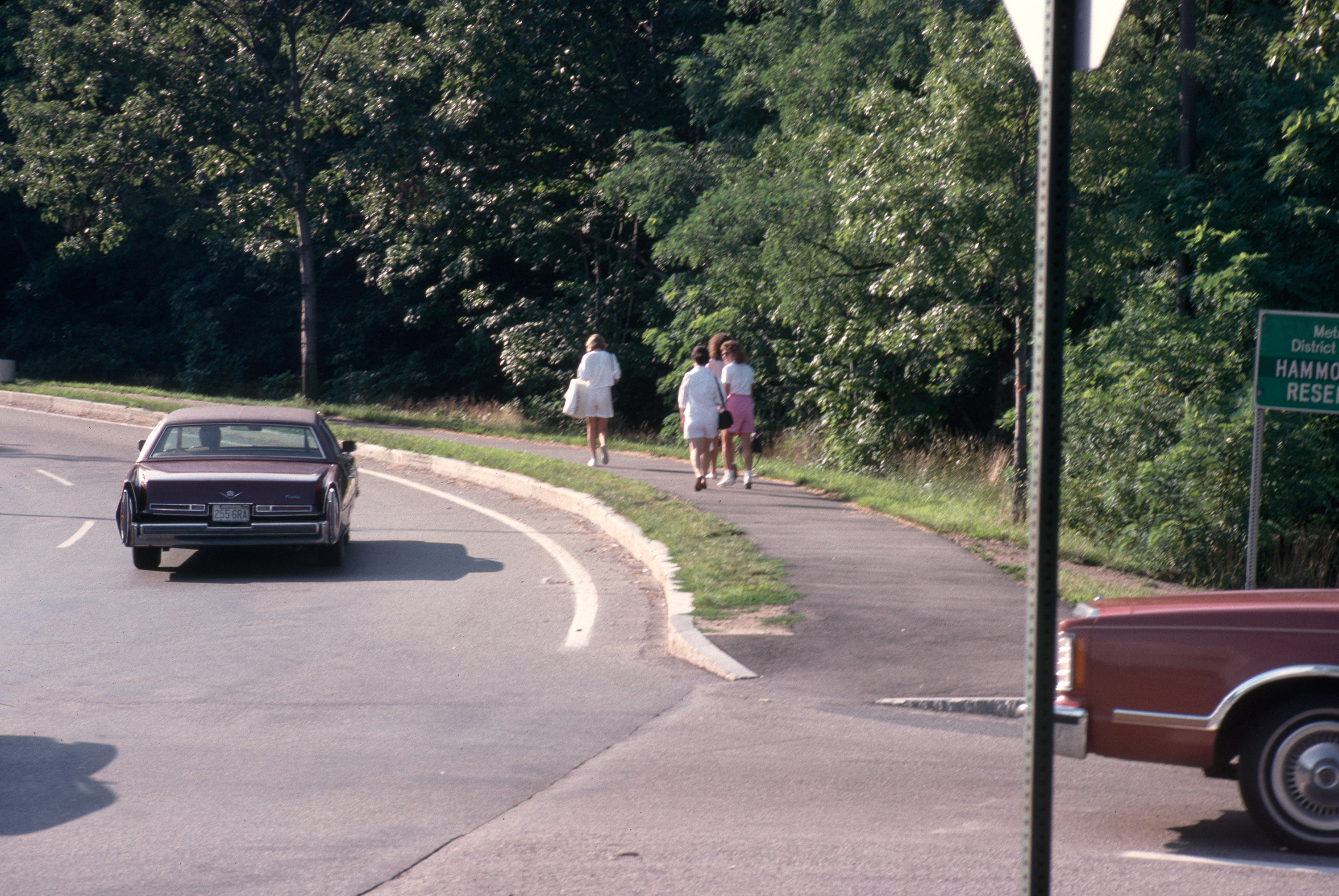 Eleven-store complex with attached string of smaller shops. general view, sidewalk leading to upper level of shopping center, 1987