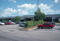 Eleven-store complex with attached string of smaller shops. exterior, parking lot, 1987