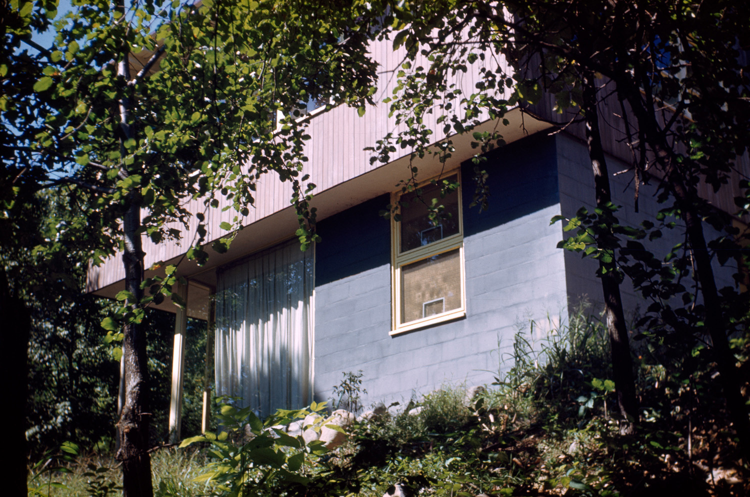 Boston Suburbs Project (Final, October 1988) general view, cinder block first floor and overhanging wooden second floor on a hill surrounded by trees, 1987