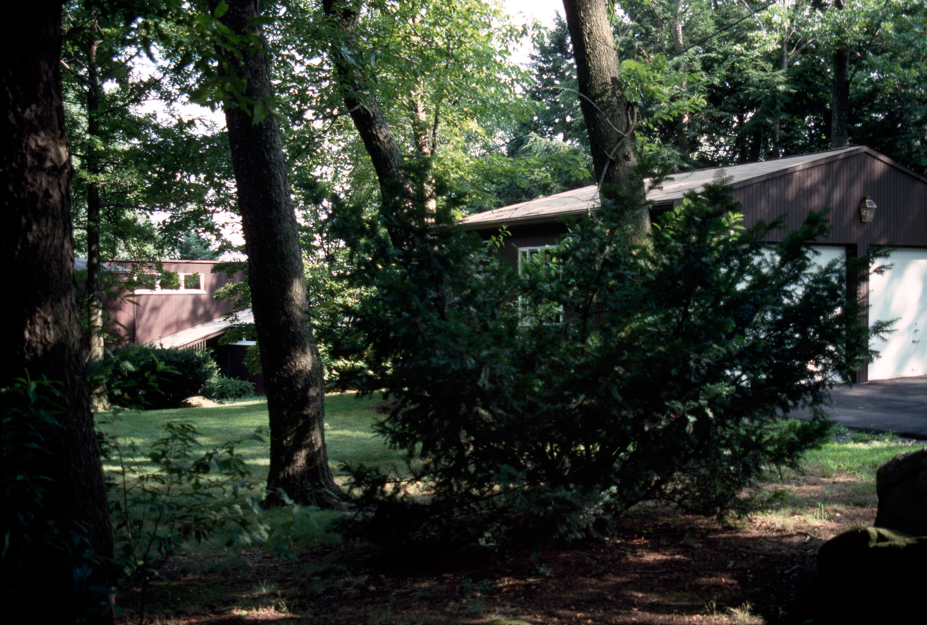 Boston Suburbs Project (Final, October 1988) general view, detached garage and house seen across lawn, 1987
