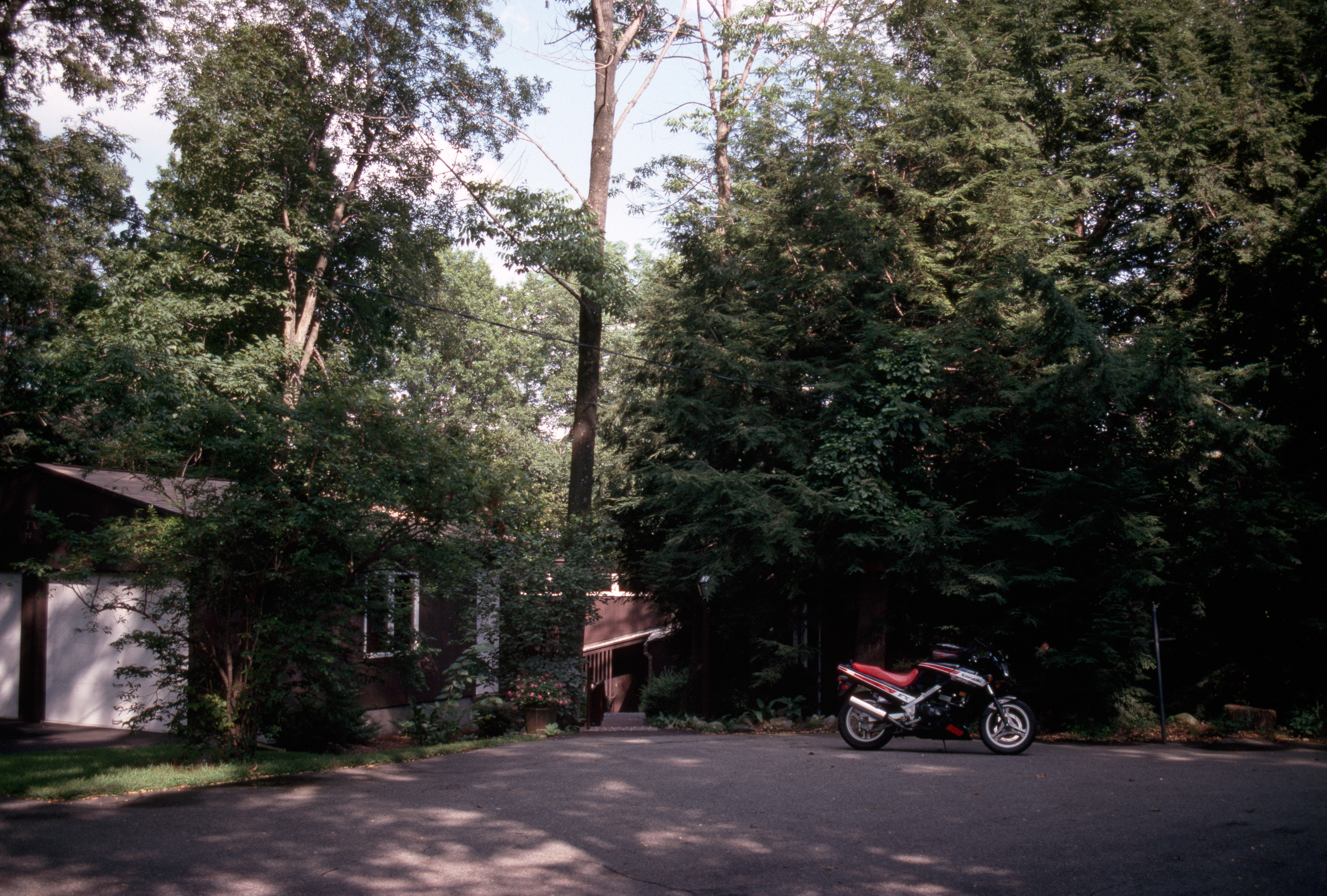 Boston Suburbs Project (Final, October 1988) general view, motorcycle parked to the side of a road or driveway, with garage to left and house visible below, 1987
