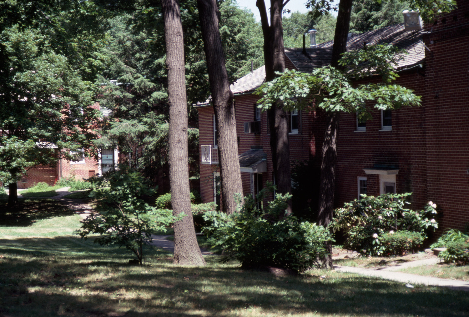 Superblock plan for garden village of duplex apartments, developed to meet postwar housing needs. general view, lawn with trees and walkway in front of a row of apartment houses, 1987