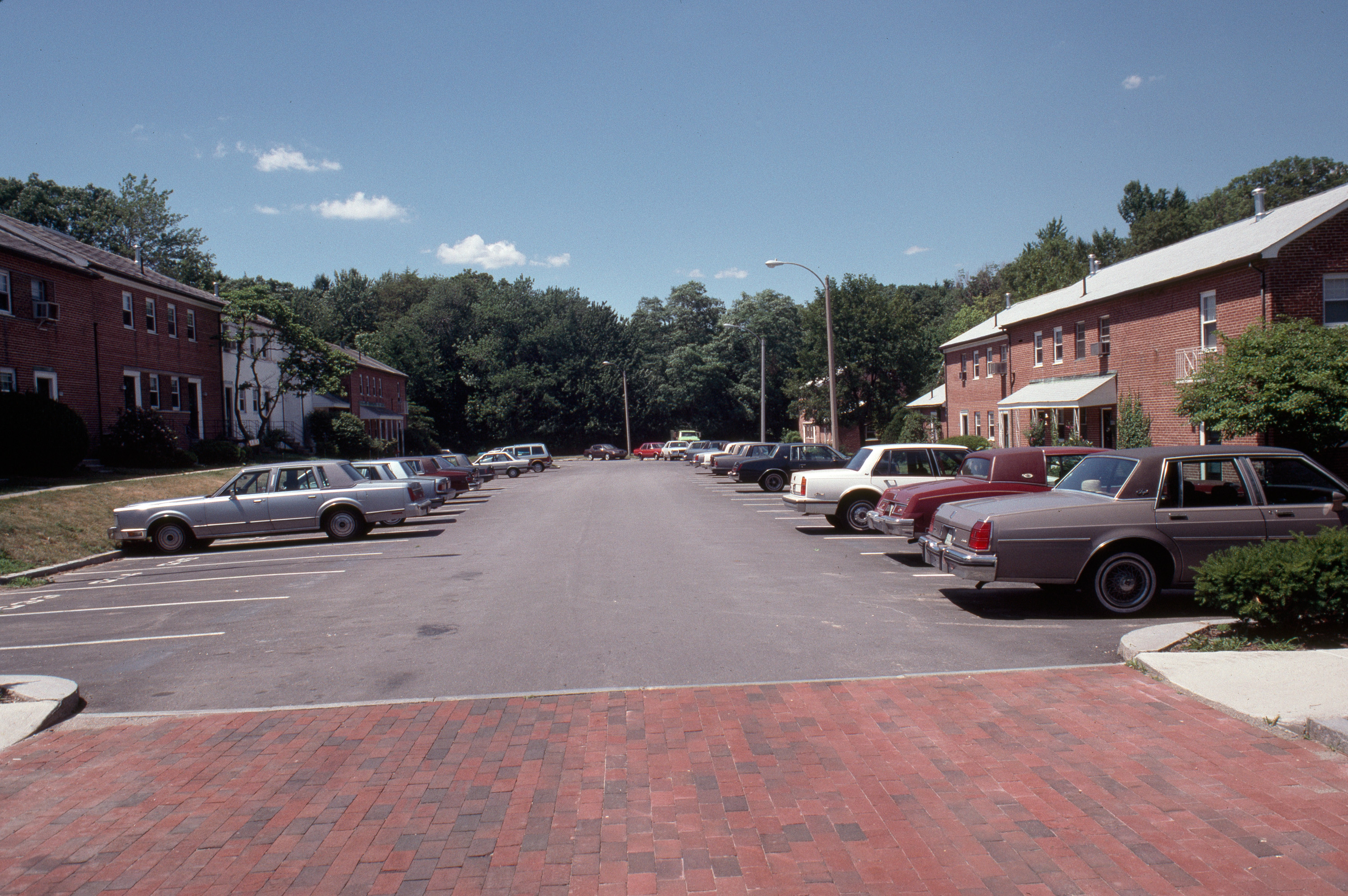 Superblock plan for garden village of duplex apartments, developed to meet postwar housing needs. general view, road with a brick crosswalk, cars and apartments on both sides, 1987