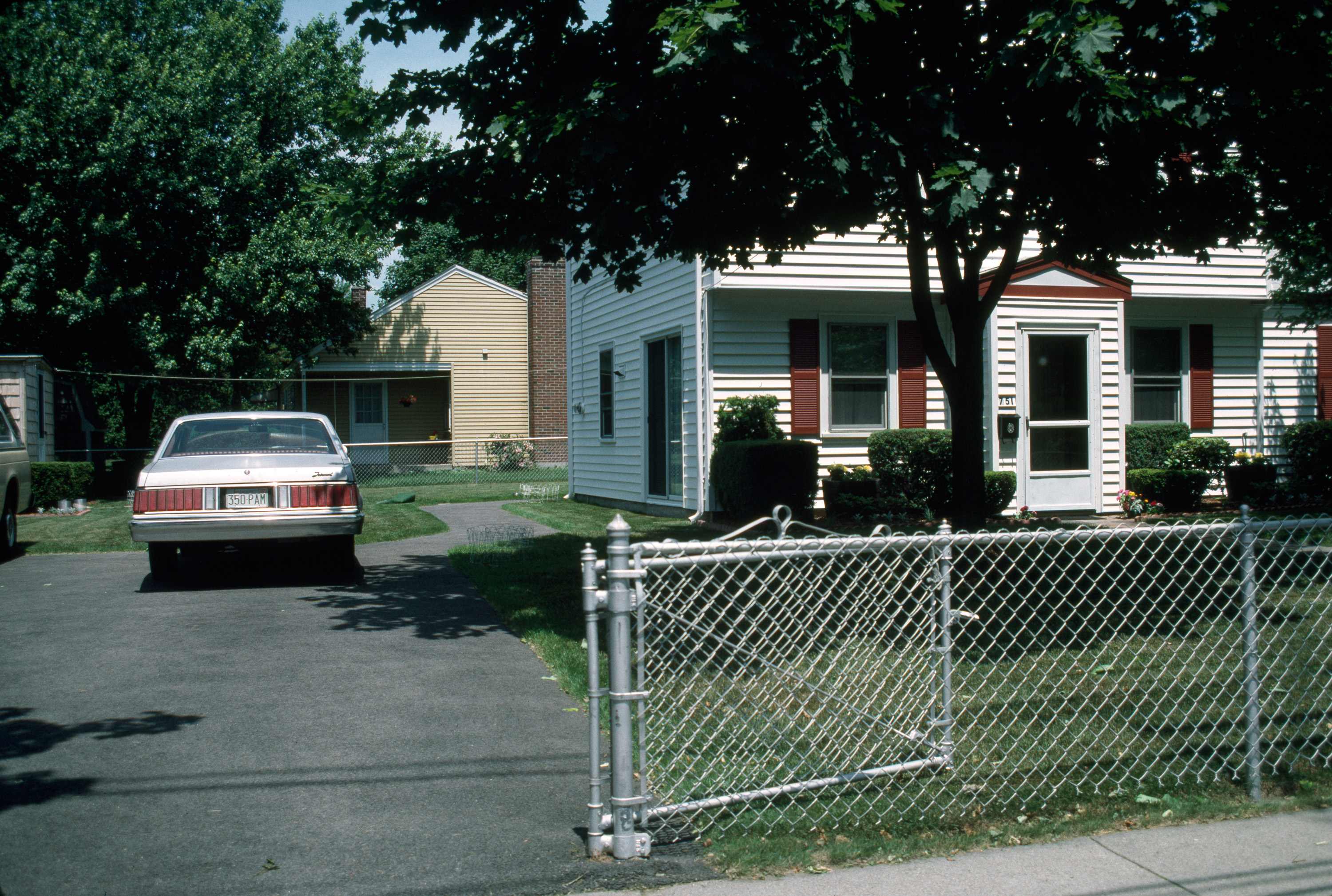Veterans' housing in campus-like plan with internal walks; included school, commercial and recreational facilities. general view, two-level house, driveway and chain link fence, 1987