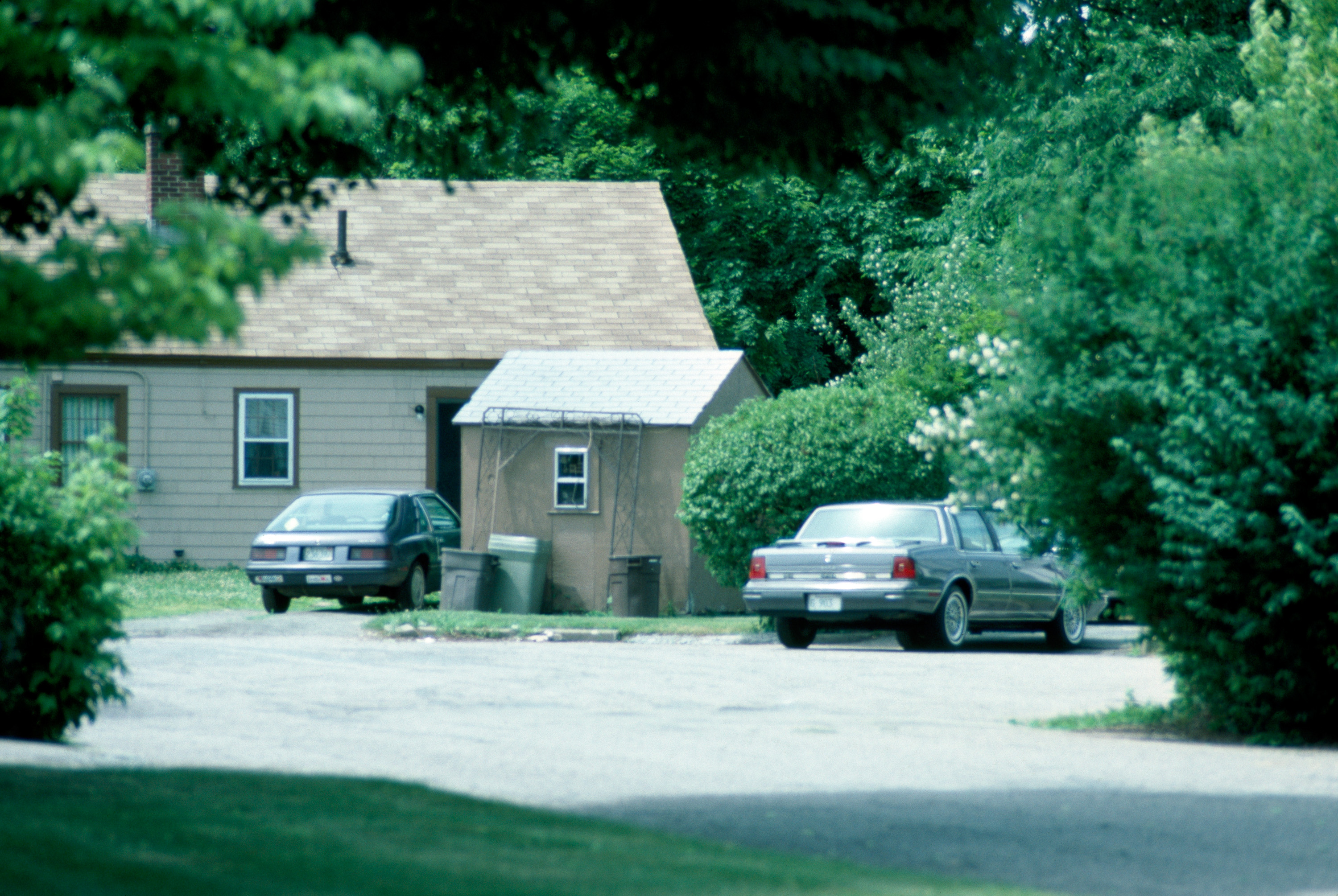 Veterans' housing in campus-like plan with internal walks; included school, commercial and recreational facilities. general view, two driveways at the end of a cul-de-sac, one house and a shed, 1987